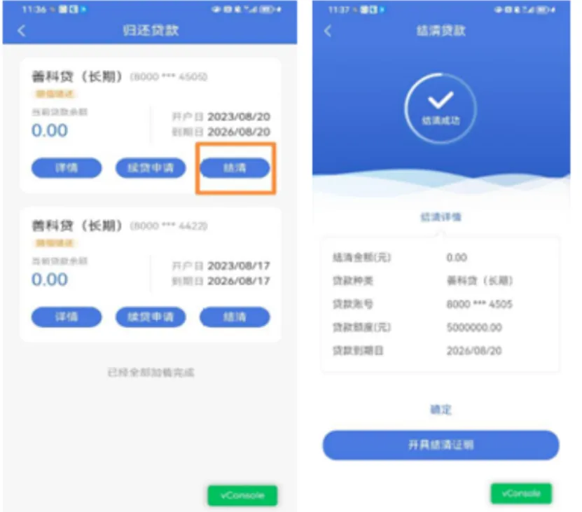 3、贷款结清:还清全部本息后可操作结清,支持开具结清证明