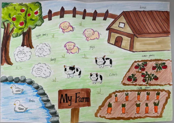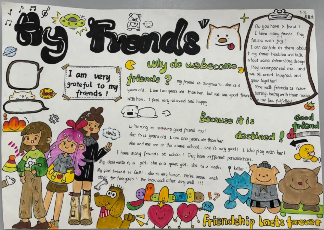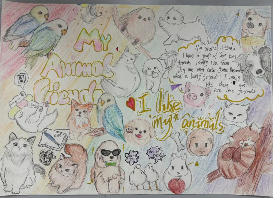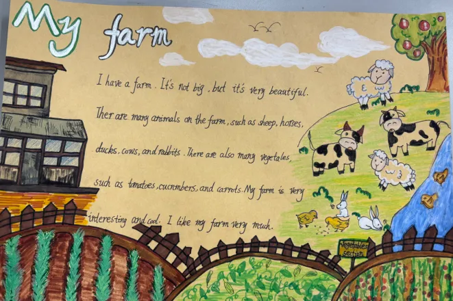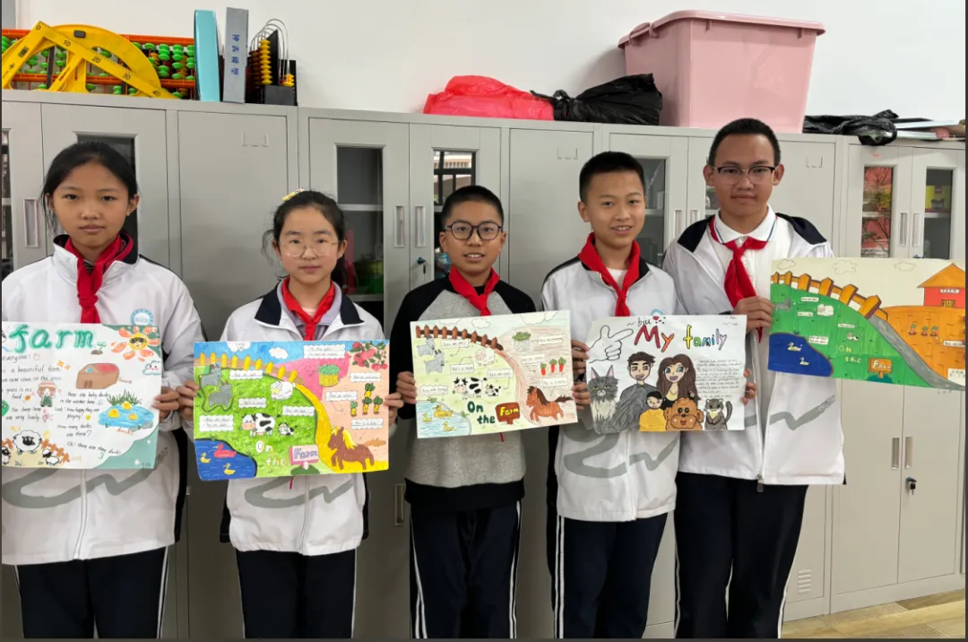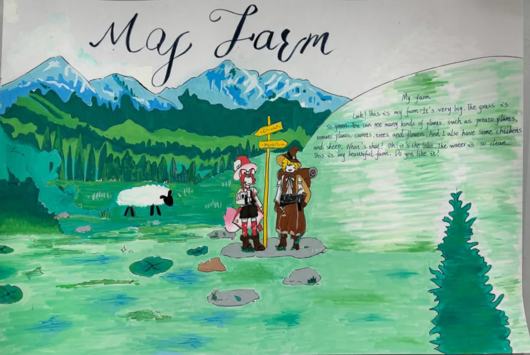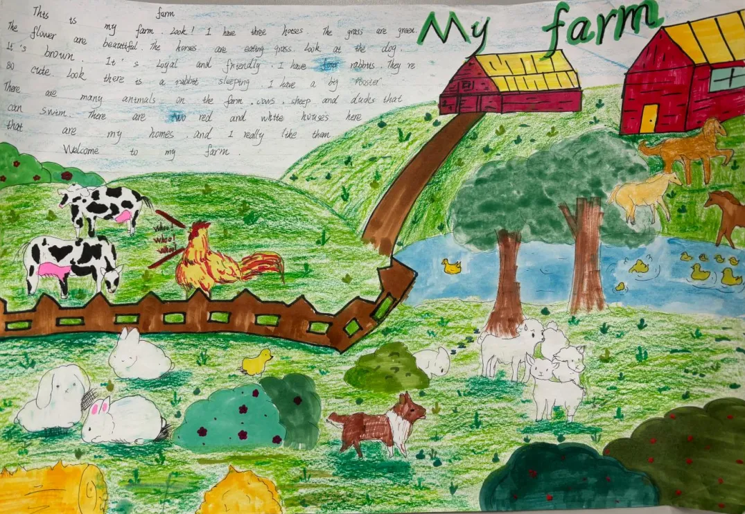 在主题手抄报活动里,每一张白纸,都是孩子们耕耘语言的花园。围绕“农场风情”“我的温馨家庭”“我最好的朋友”等主题,学生们用彩笔勾勒边框,用英文书写心声,将美术才情与语言功底交织成一幅幅精美的手抄报。那一行行工整的手写英文,便是少年向世界递出的第一张名片。