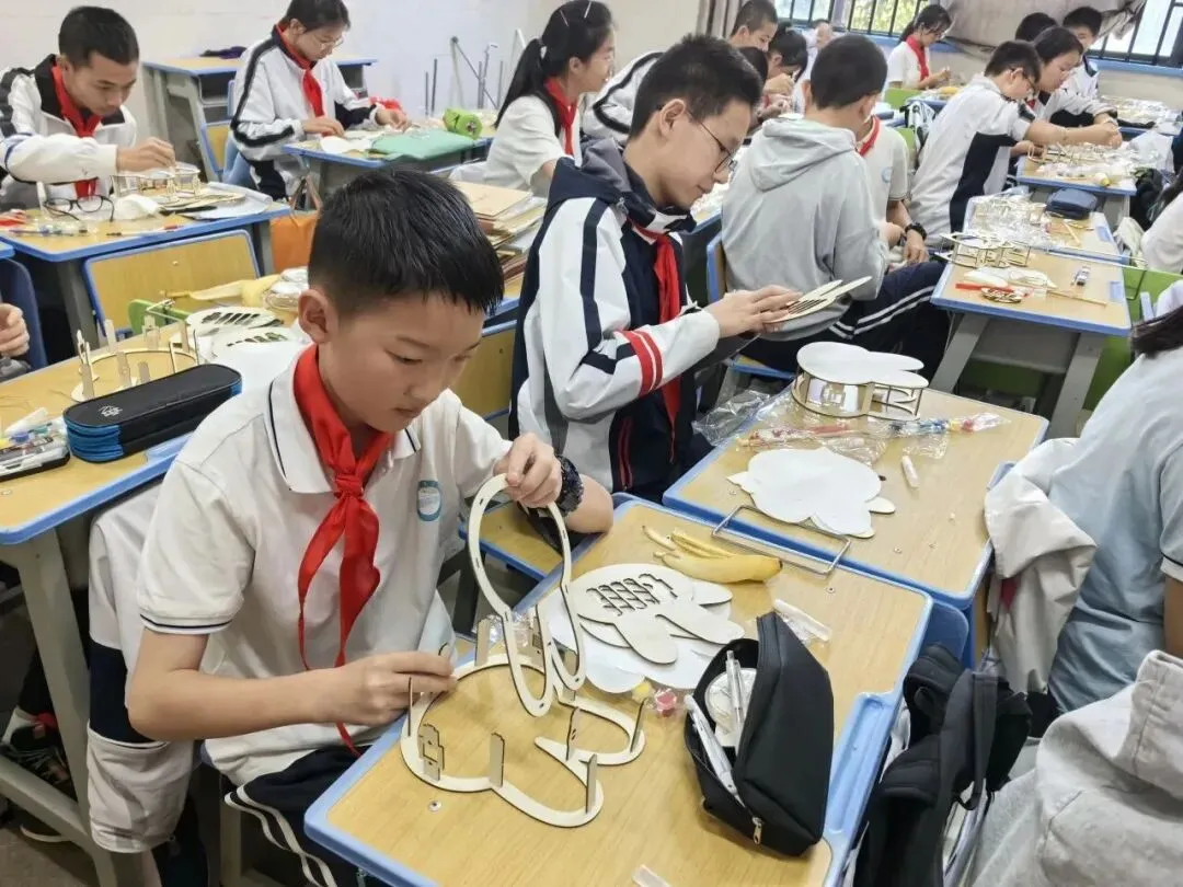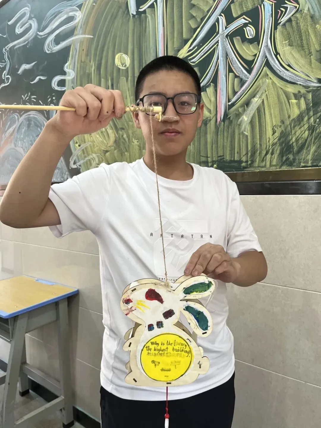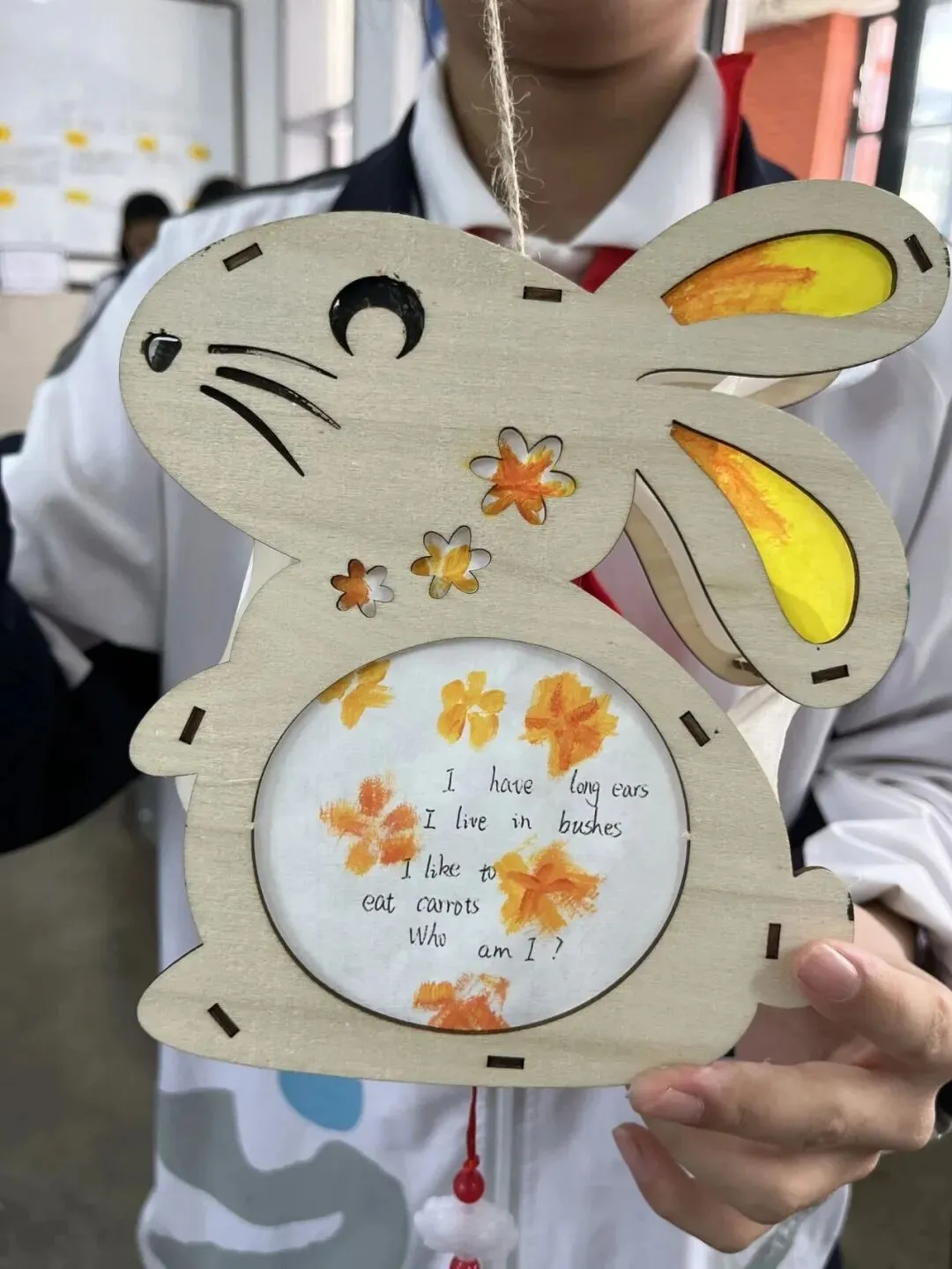 东方器物说出西方的语言。当英语遇见中国传统手工艺,文化的对话便悄然发生。在制作灯笼的活动中,孩子们一面勾勒梅兰竹菊、青绿山水,一面用工整的英文题写诗句或祝福语。“May the breeze bring peace”(愿清风携宁静而至)、“Chase your dream”(追逐你的梦)——东方美学的留白与西方语言的直白,在扇面上达成默契的和解。暖黄的光透过纸面,映出那些稚嫩却真诚的字迹,仿佛千百枚小小的月亮被孩子们捧在掌心。文化之美与语言之光交织生辉。