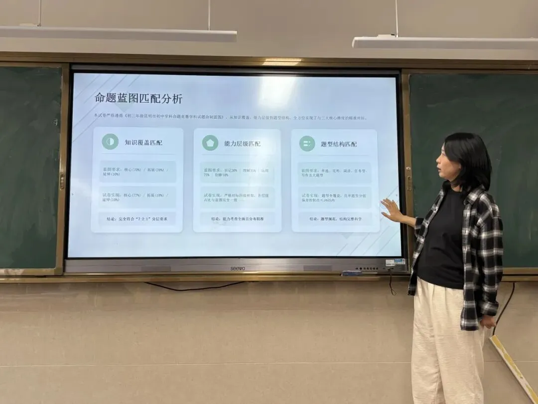 她首先展示了命题蓝图匹配分析——知识覆盖上,核心72%、拓展18%、延伸10%,完全契合“7:2:1”分层要求;能力层级上,识记、理解、运用、创新分布精准;题型结构上,五大题型全面覆盖,单题分值偏差控制在5%以内。“数据不会说谎,每一组数字背后,都是对中考方向的敬畏与追随。”