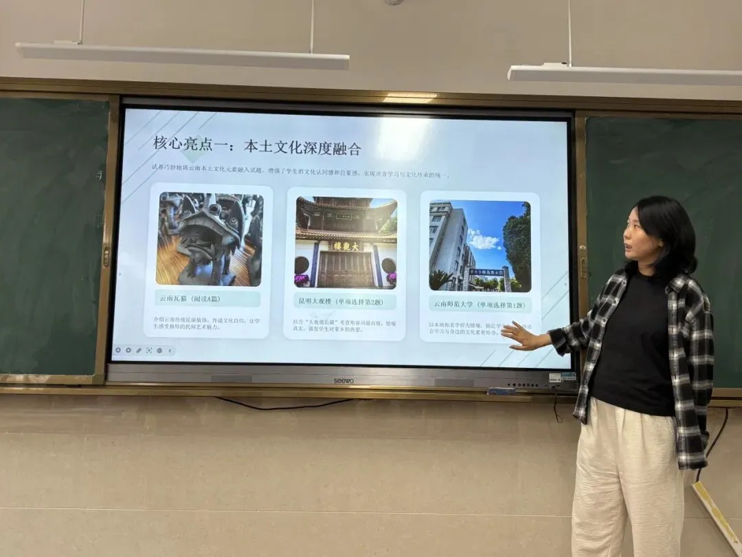 亮点展示环节,张老师如数家珍。本土文化深度融入——云南师范大学、大观楼长联、瓦猫等昆明元素贯穿试卷,让答题有了乡土的体温。时代热点精准结合——阅读D篇探讨AI社交礼仪,引导学生思考科技与人文的辩证关系;2026世界杯语境嵌入单项选择,让语法考查鲜活有趣;写作题“A Sweet Memory”引导记录生活中的美好瞬间,在笔尖自然流淌真情。