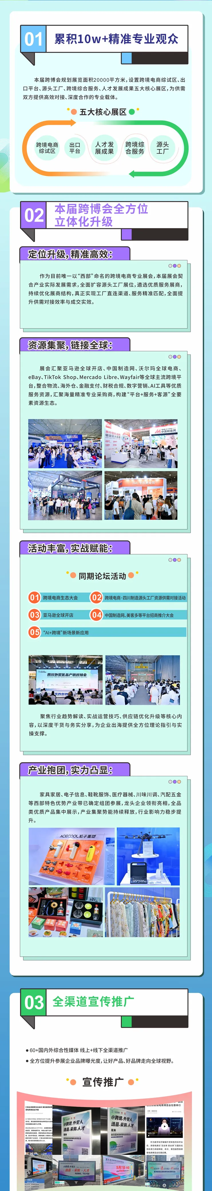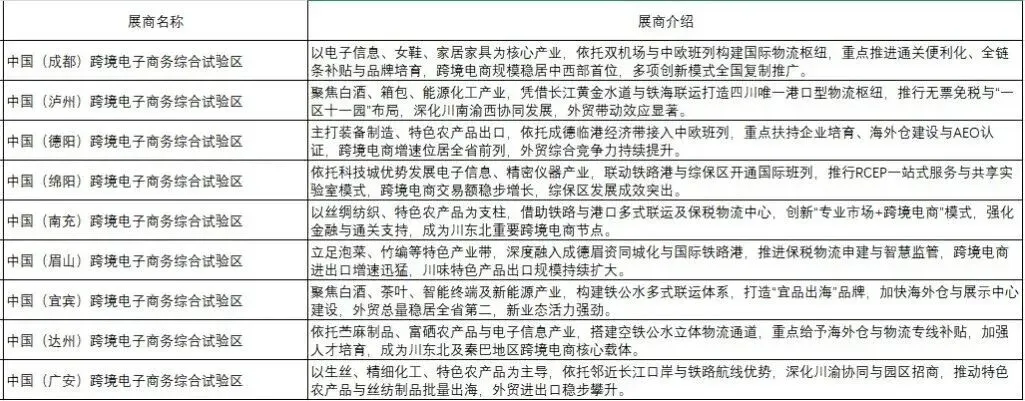 - 跨境电商综试区展区:集结四川9大综试区,集中展示成果与特色品牌,共探协同发展路径。
