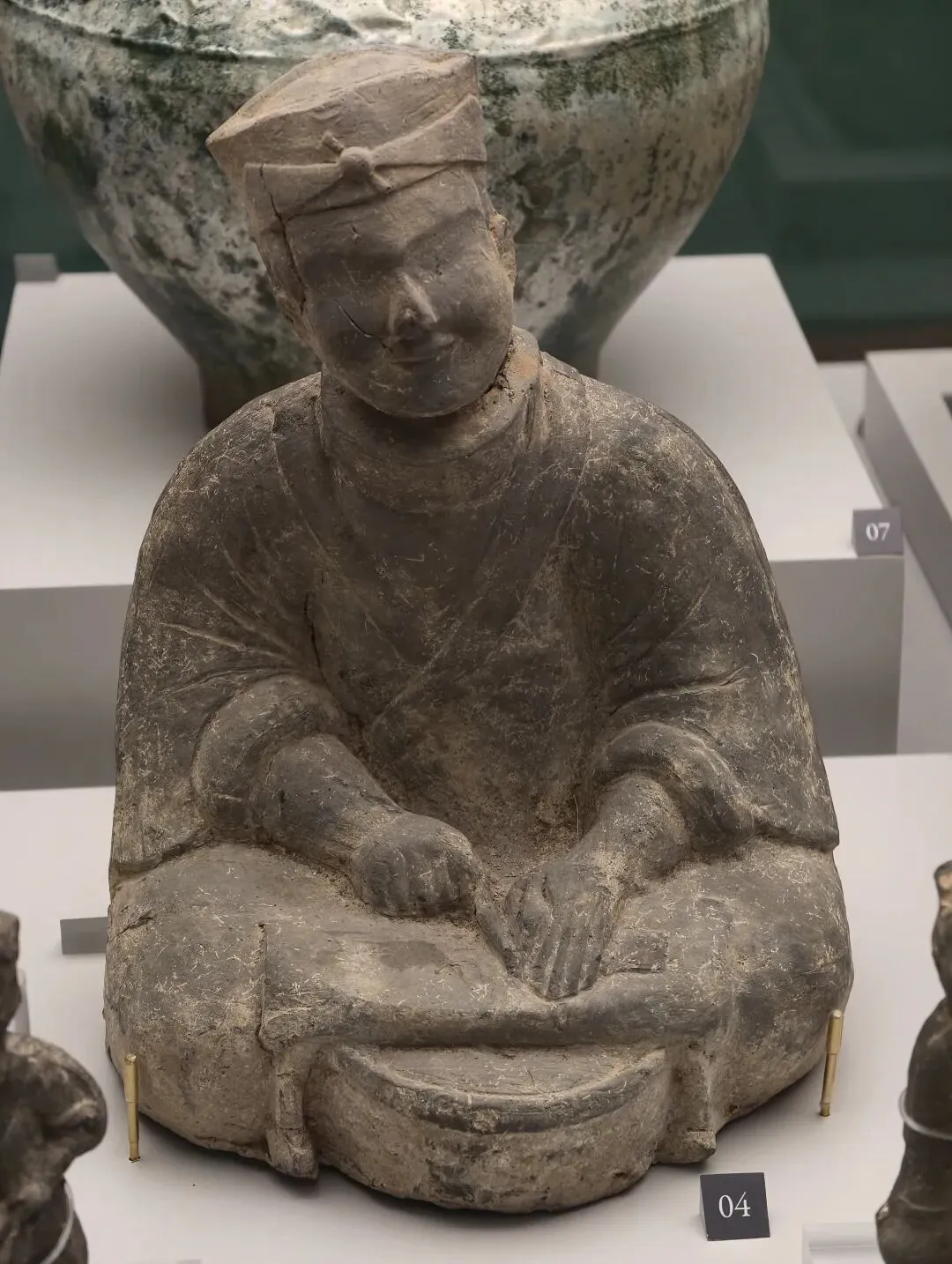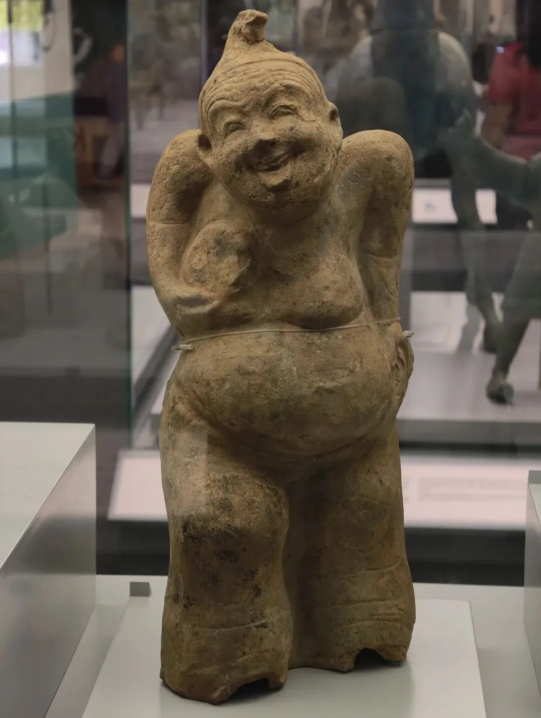 俳优俑,又叫说唱俑,一手持鼓,一手提裤,正在进行说唱表演,其形体夸张,表情幽默诙谐,是四川地区汉代墓葬中具有特色的随葬陶器。