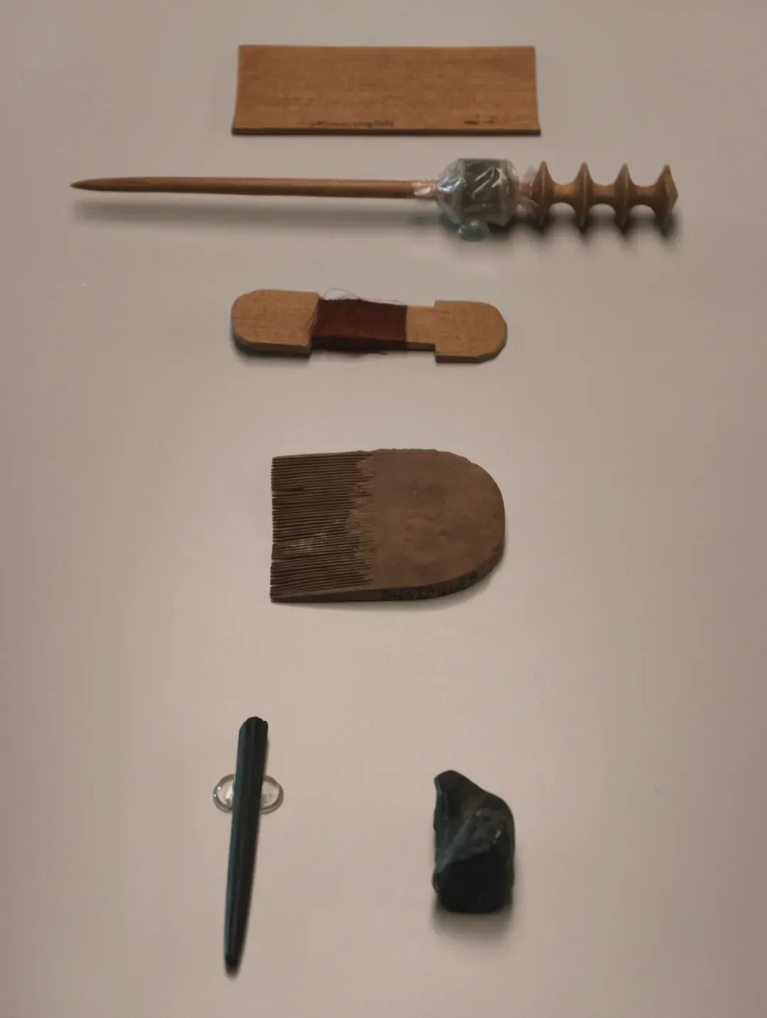 石眉笔和眉石是古代妇女化妆用品,使用时,用眉笔在眉石上研磨,沾取黑色粉末可以美眉,是东西文化交流的典型例证。/ 木篦为梳理头发的工具,由整块木料雕刻而成,反映汉代西域居民日常生活用品的制作水平与实用特征。