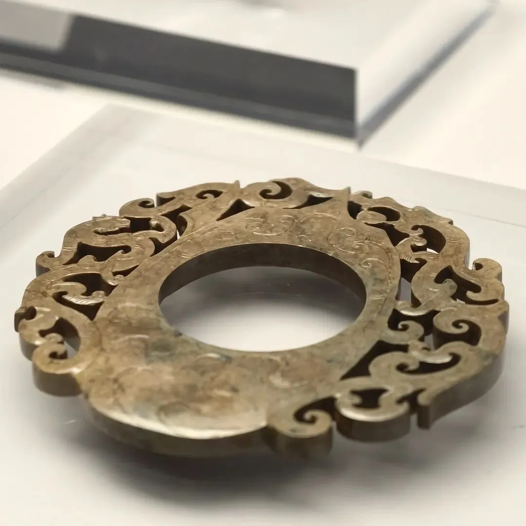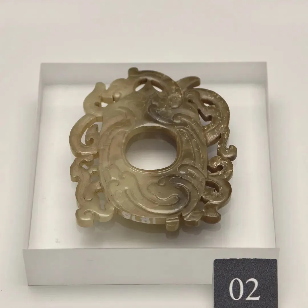 青白玉,有褐色沁。扁平体,两侧镂空龙、凤、螭虎纹,是汉代高等级贵族的佩饰,象征身份与祥瑞。