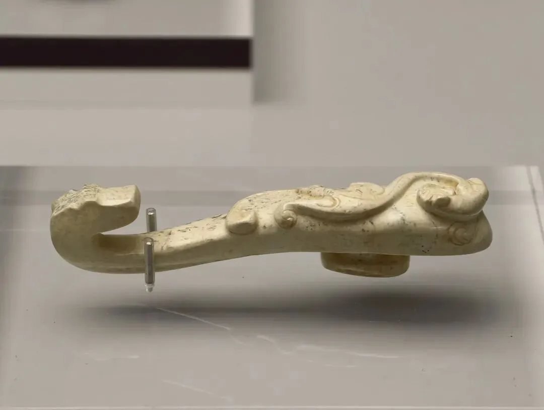 带钩钩体微凸,钩身细长,钩部稍窄,兽形钩首,器身上高浮雕一螭。汉人喜以精美带钩来表现身份与地位。