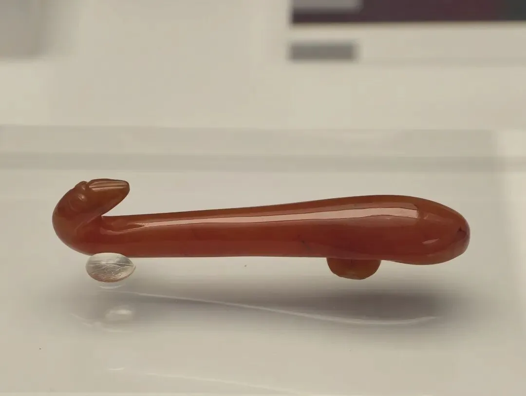 钩首作回首龙形,钩身呈琵琶形,钩钮呈椭圆形,材质温润,造型灵动,体现了汉代贵族对玛瑙等珍稀材质的喜爱。