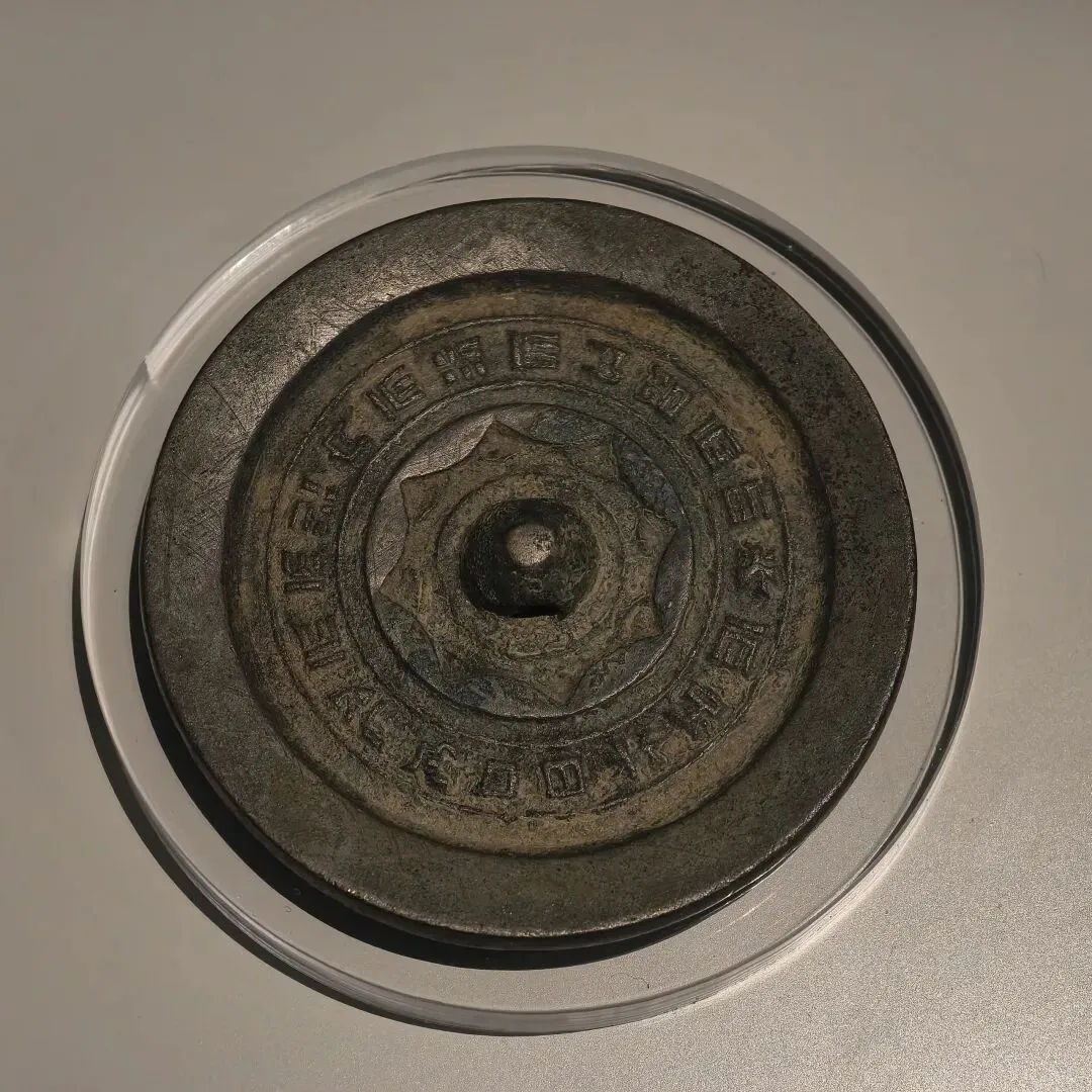 铜镜内圈沿铸的铭文为汉代铜镜常见吉语类。铜镜中心铸有方形纹理,沿边篆书十二地支及「大吉」。