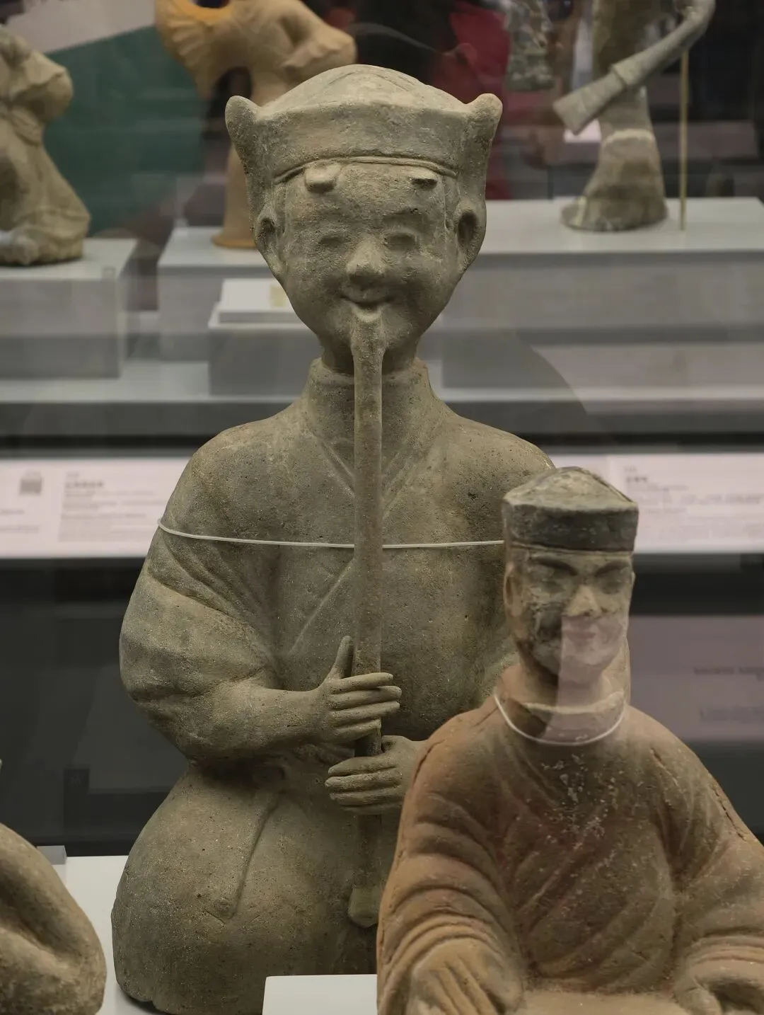四川汉墓中出土的吹箫俑常与抚琴俑、击鼓俑、俳优俑、舞蹈俑等一起出现于东汉时期较高级别的墓葬中。吹箫俑在乐队中居于和音伴奏地位,在不同场面发挥着重要作用。