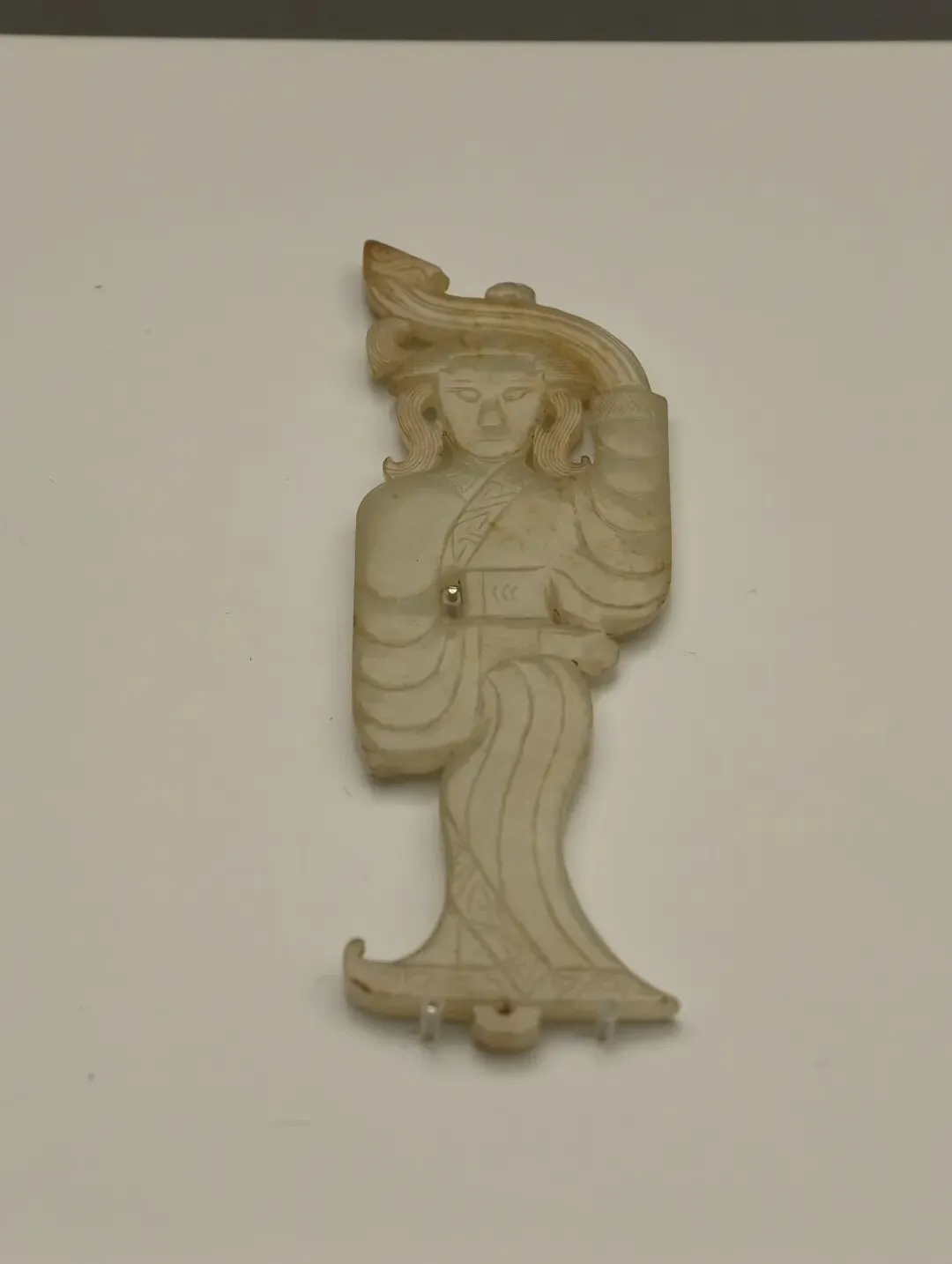 玉佩双面透雕舞人,色泽温润,舞人线条优美,形象栩栩如生。