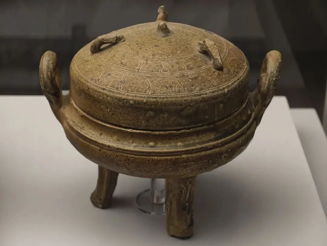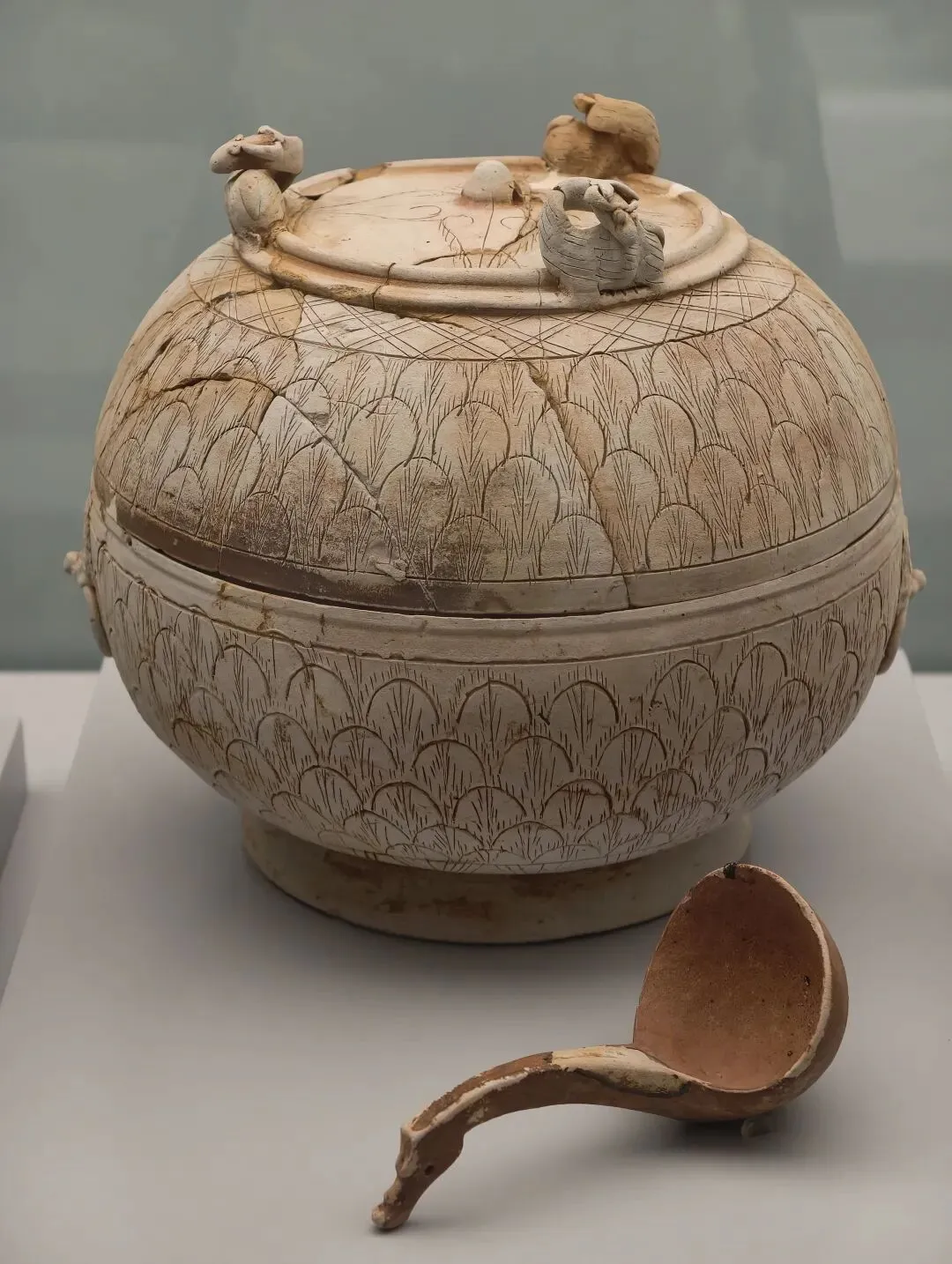 这个陶盒附有一勺,作为随葬明器,象征着死者在地下世界仍享受着食物。