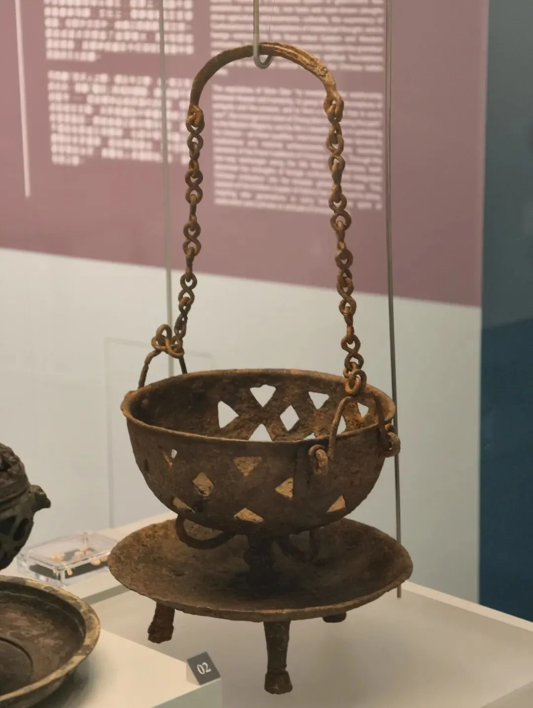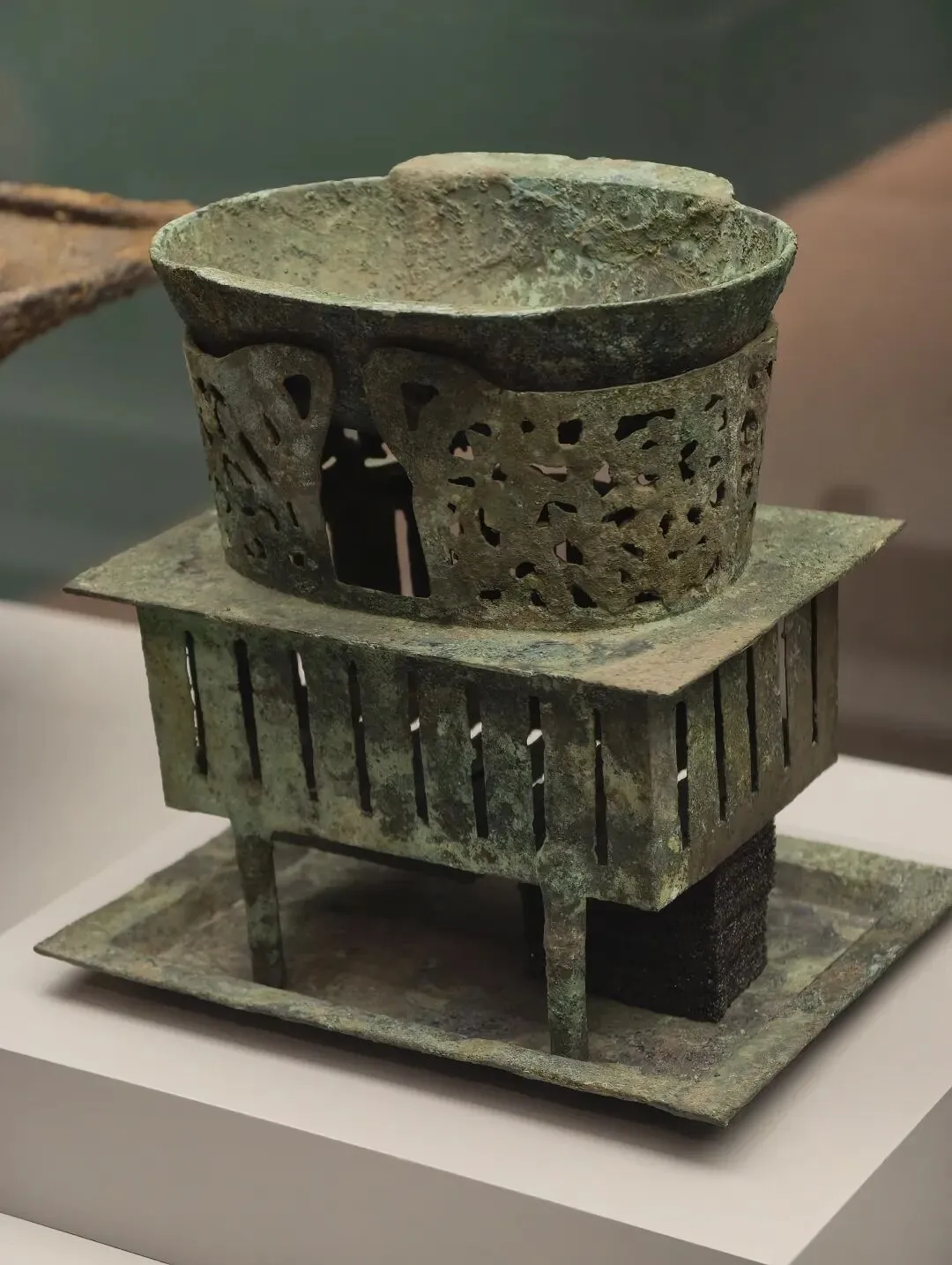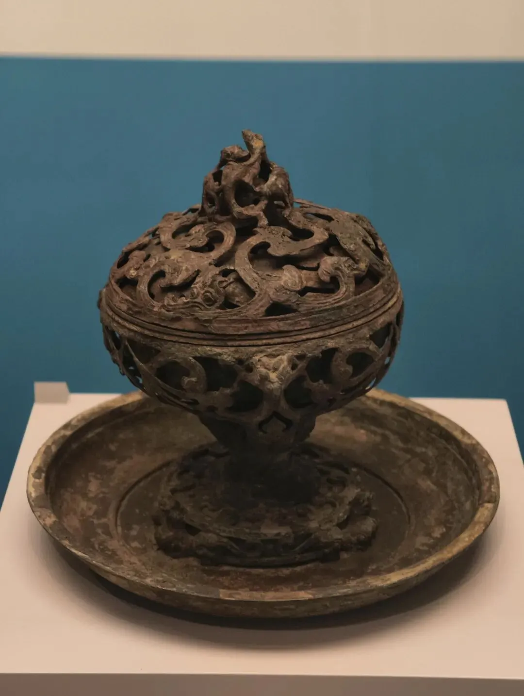 此炉镂空碗状物,当为放置香料之用,余烬通过镂孔漏入下部实心盘内。