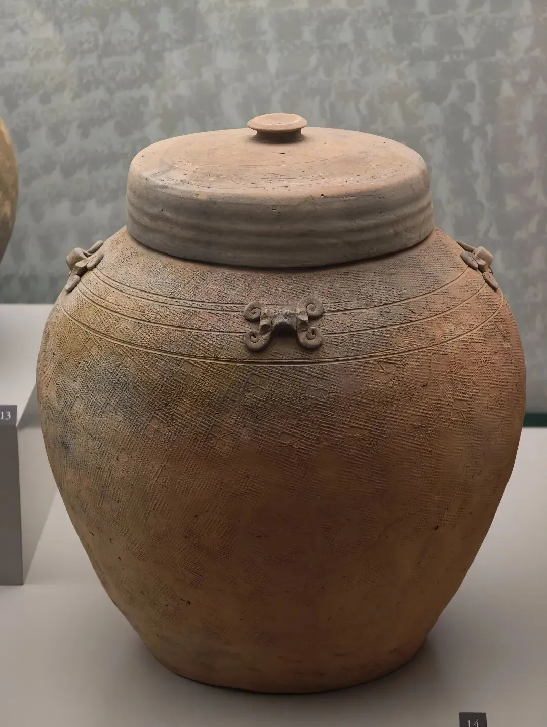 陶甕的肩部对称置有四个横系,通体在方格纹地上戳印米字纹。在陶罐上拍印方格纹和加盖戳印,是汉代岭南地区盛行的陶器装饰。