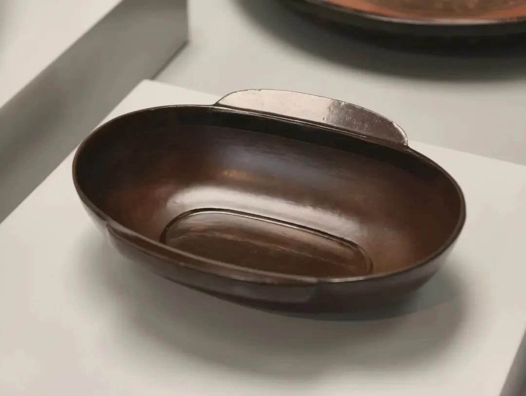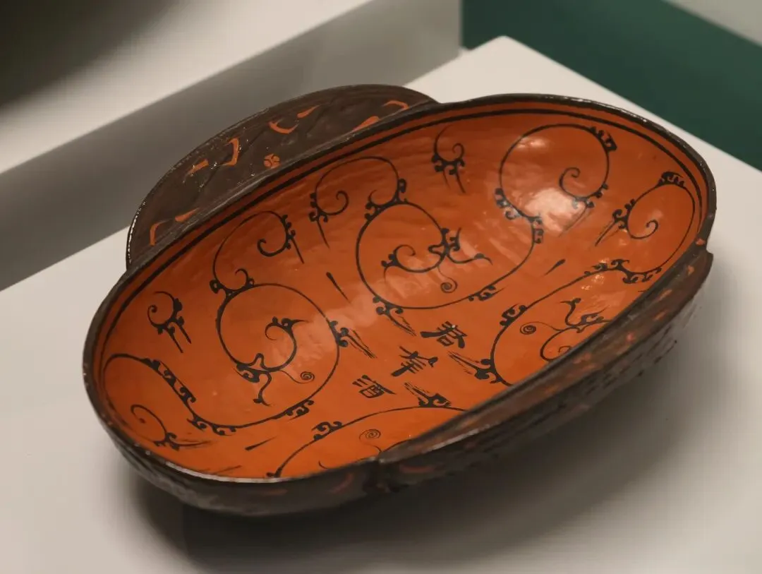 耳杯底黑漆书「君幸酒」三字,即「请君饮酒」之意。「耳杯」或称「羽觞」,古时用于盛酒或盛羹。
