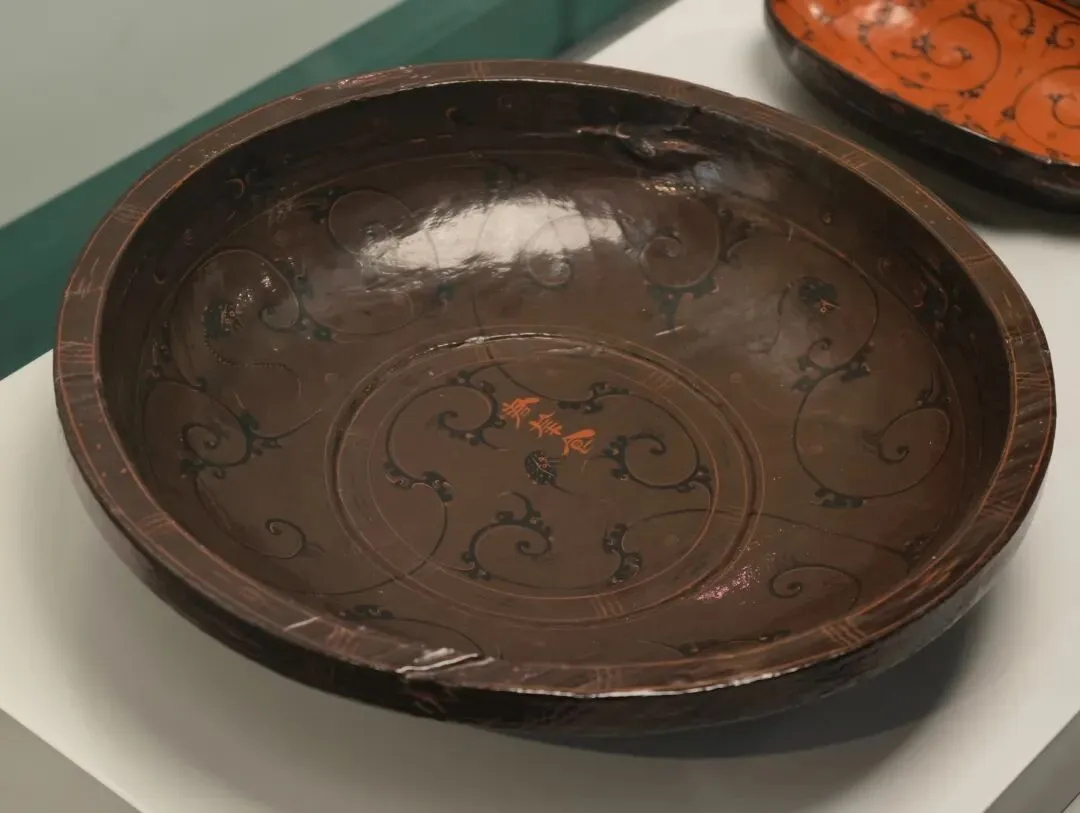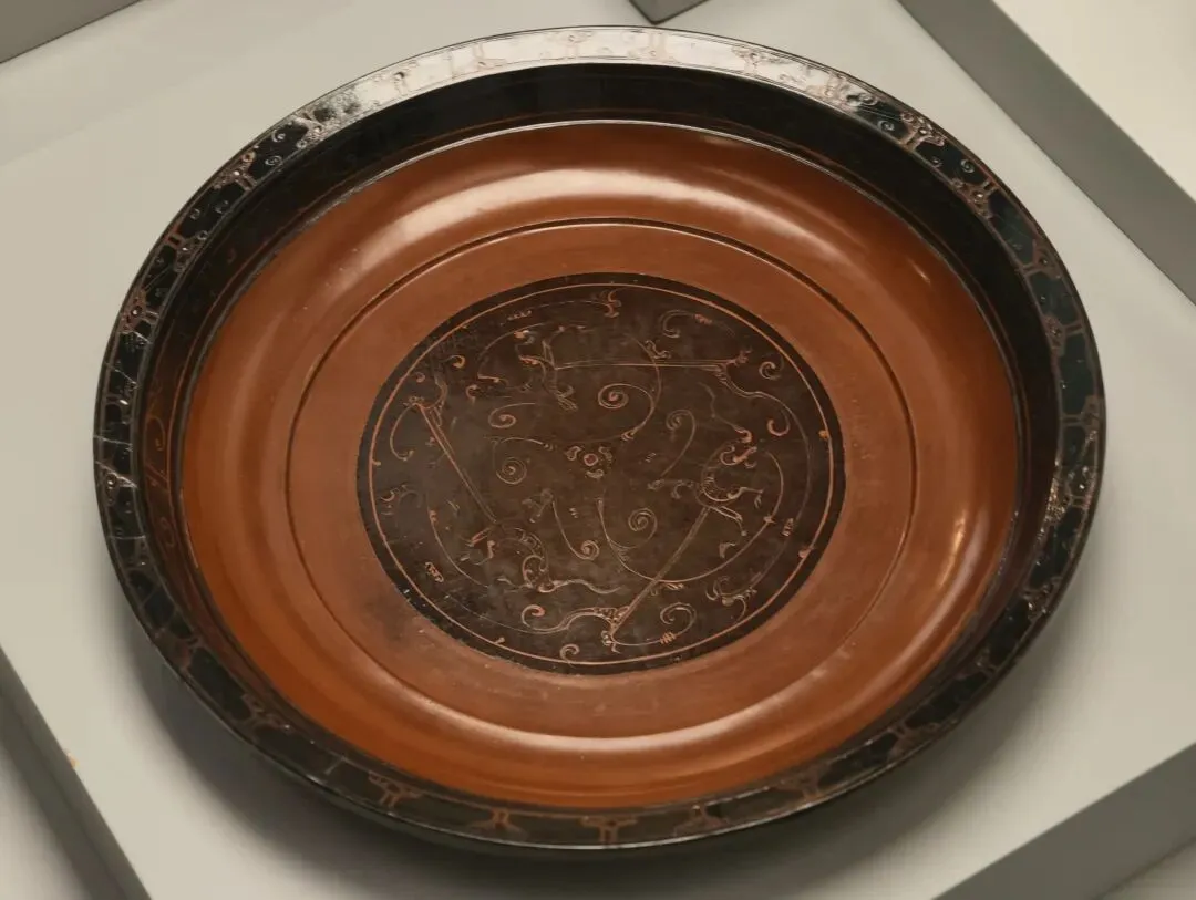 海昏侯墓出土漆盘一百五十九件,器形规整,内外髹漆,多彩绘云兽纹,部分漆盘外底或内底上刻有朱漆文字。