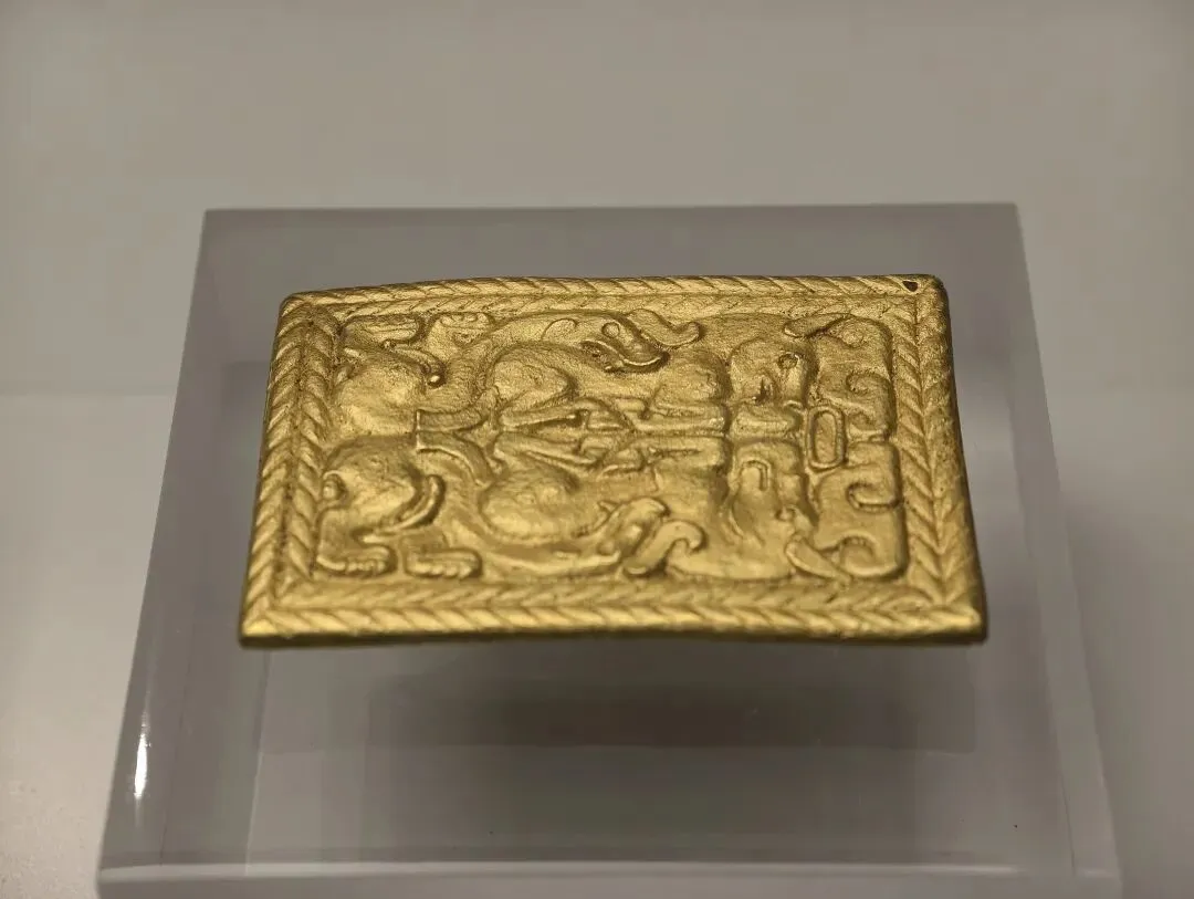 金饰牌有上下对称及相同的纹饰;兽头反身、长耳、虎爪,嘴咬马背,其兽似为希腊神话传说中的变形「格里芬」,是一种鹰头狮身有翅的怪兽。