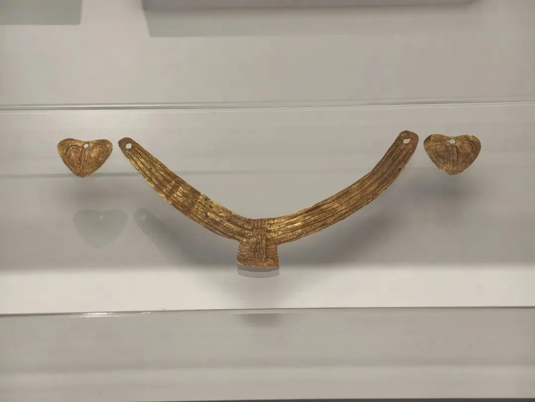 金项饰的正面依其形状施四道突棱纹。另有两片桃形饰件装饰两端。此金项饰属拓跋鲜卑文化的产品。