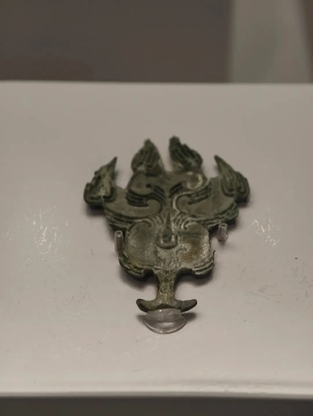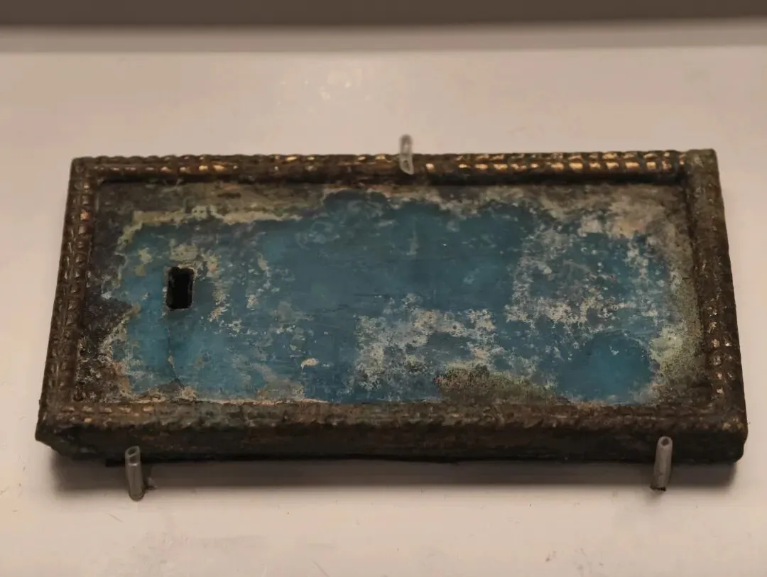 这件嵌平板玻璃的铜牌饰与匈奴式动物纹铜牌饰同时出土。南越王墓共出土这类玻璃共二十二件,西汉平板玻璃尚属首见。