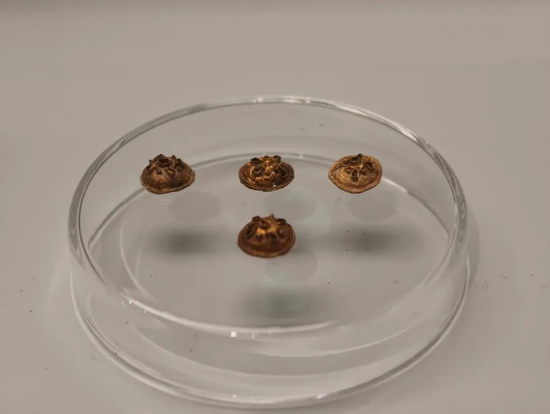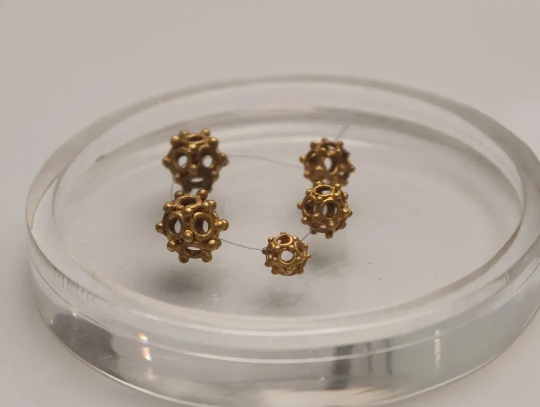 为墓主人所穿「珠襦」上的纹带饰物。这种焊珠工艺与西方出土的多面金珠上的小珠焊接法相同,饰物源出西方,是中国境内发现年代较早的舶来品。