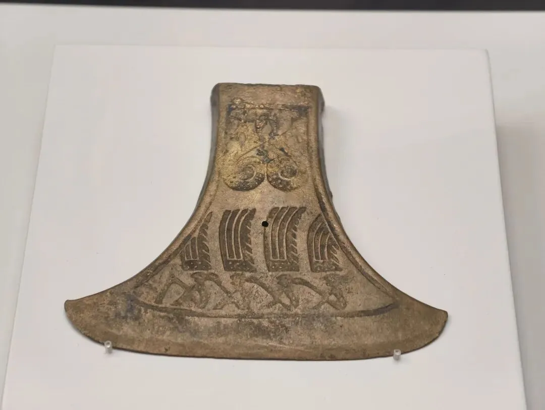 正面上方为两条相向的龙,昂首向天;下方以边框底线表示狭长的轻舟,上坐四人,头戴羽冠,作奋力划船状,传递出越人的龙蛇图腾及水上竞渡等资讯。宁波先民属越人,铜钺上的「羽人」,反映了百越民族的「鸟神」崇拜。显示汉代的东南沿海地区,仍是古越人聚居之地。