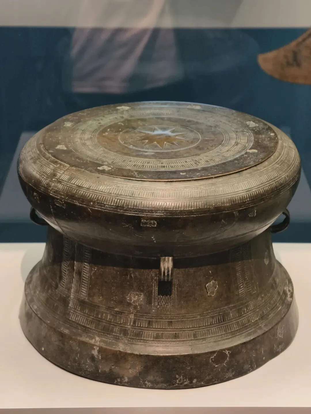 属石寨山型铜鼓。鼓面饰太阳纹(十芒);胸上部和腰下部饰栉纹;胸下部饰两组裸体羽人划船纹。 「羽人船纹」与古代百越民族崇尚河海文化,崇拜鸟和太阳等图腾有关。