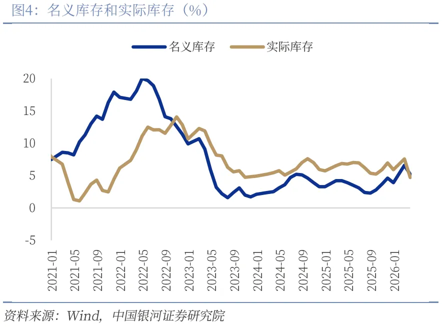 库存状态转为主动去库。1—3月产成品存货6.78万亿元,同比增长5.2%(前值6.6%),扣除价格因素的实际库存增速4.7%(前值7.4%),名义库存和实际库存增速均存在一定程度回落。考虑到1—3月营业收入增速的下行,本月库存变动属于主动去库。目前企业选择在生产和销售中维持“紧平衡”的态势,根据需求变化随时动态调整生产水平。一方面,需求修复呈现出结构性特征,尤其是高技术制造、装备制造和消费品和有色等中上游行业;另一方面,原材料价格波动较大,尤其是油价和化工品价格的上行,增加了生产的不确定性,使得企业在补库上保持谨慎态度,避免因价格波动导致的成本压力。