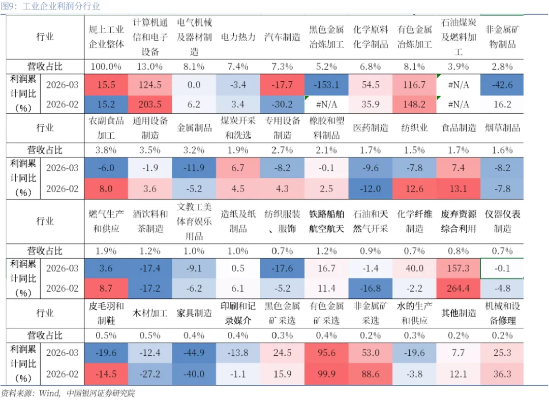 本文摘自:中国银河证券2026年4月27日发布的研究报告《利润维持高增,行业分化加剧——2026年1-3月工业企业利润分析》