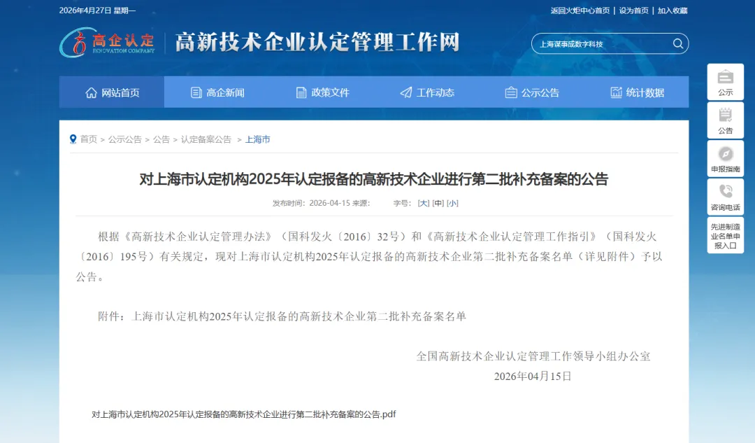 2026年4月15日,全国高新技术企业认定管理工作领导小组办公室对上海市认定机构2025年认定报备的高新技术企业第二批补充备案名单予以公告。165家符合条件的企业赫然在列。