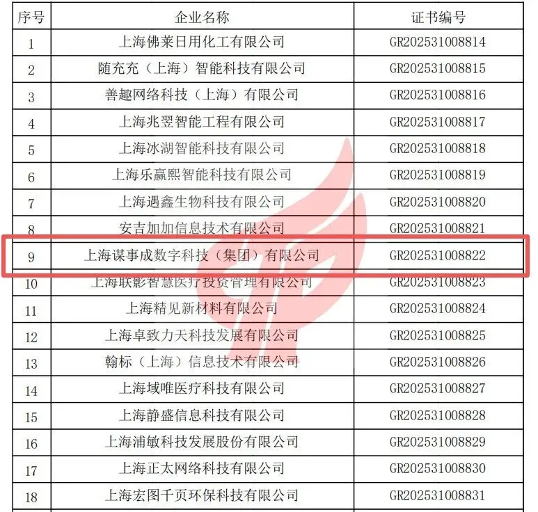 上海谋事成数字科技(集团)有限公司,证书编号GR202531008822(乐聘网所属公司,以下简称“谋事成集团”)凭借扎实的研发实力、突出的科技成果转化能力及规范的经营管理,成功入选。