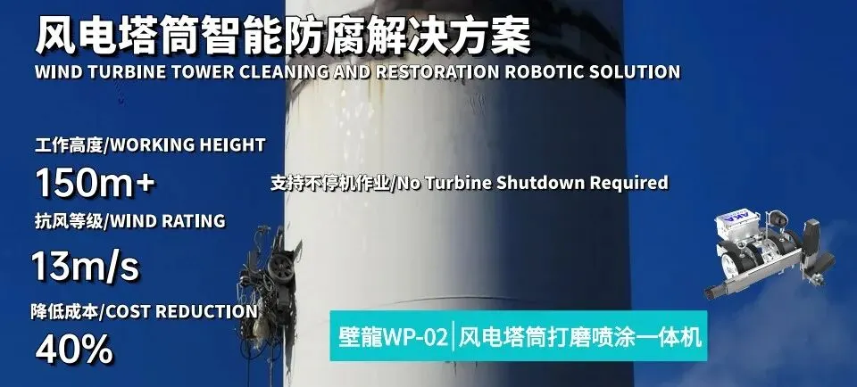 为解决风电塔筒高空运维的“老大难”问题,行知行展示了壁龍WP-02风电塔筒打磨喷涂机器人。它具备60kg负载与抗风风速13m/s的强稳定性能,可携带打磨、喷涂或检测模块沿塔筒自主爬升作业。替代传统的“蜘蛛人”和大型吊车,在风机不停机的情况下完成高效维护,大幅降低运维成本与安全风险。