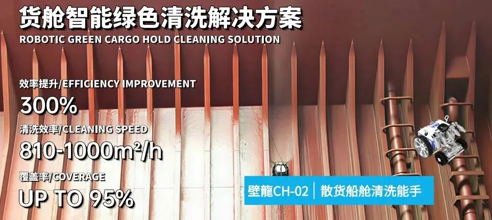 聚焦散货船货舱清洗的效率和验舱难题,展示的壁龍CH-02货舱清洗机器人凭借独特的磁吸附自适应底盘,能稳定通过100°-250°的舱壁折角,在狭窄的肋骨间隙中自由穿行,实现95%以上的清洁覆盖率。以810-1000㎡/h的清洗效率,将传统需数十工时的作业时间大幅缩短,并依靠纯物理清洗确保验舱一次通过,助力船东实现“到港即装货”。