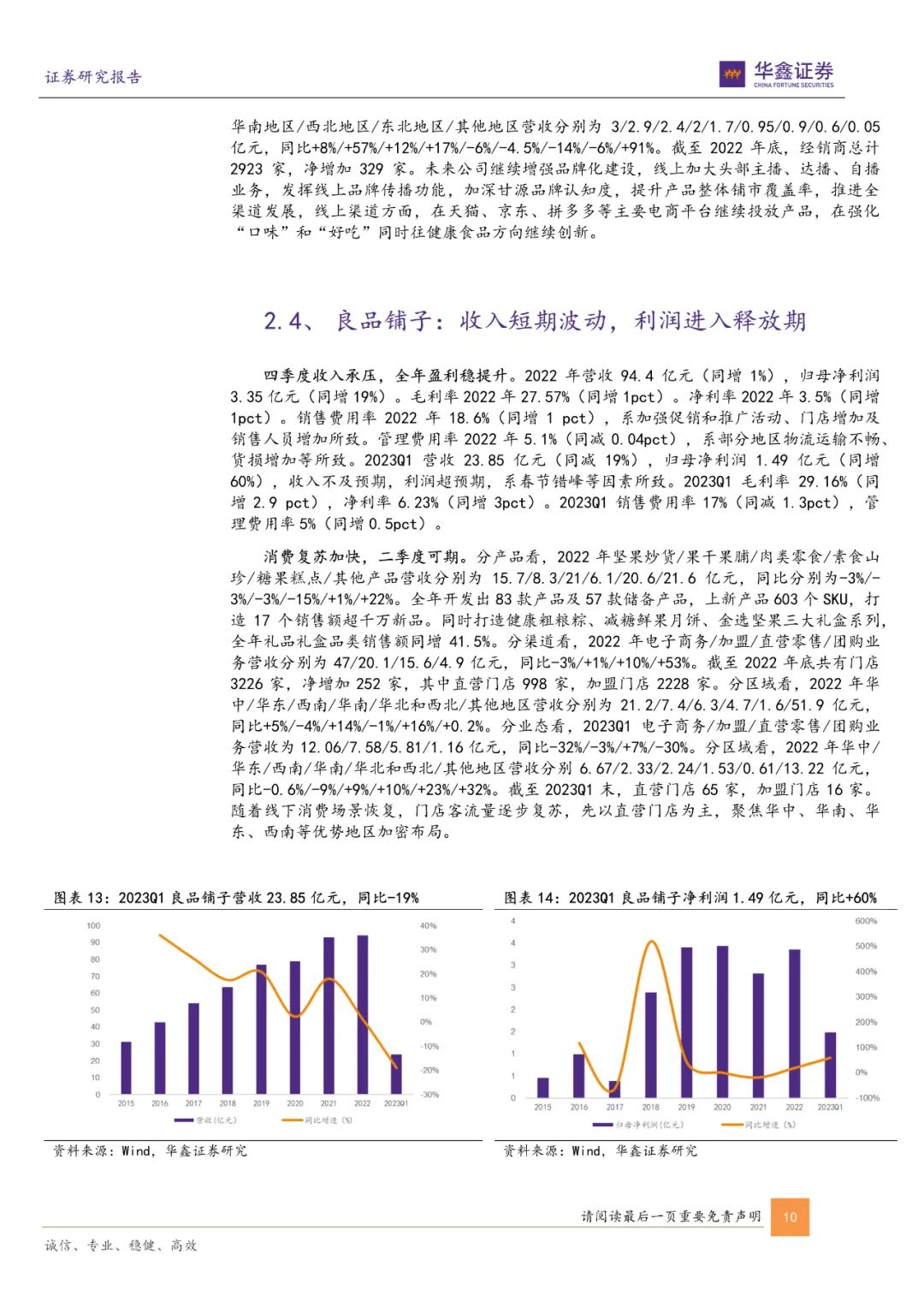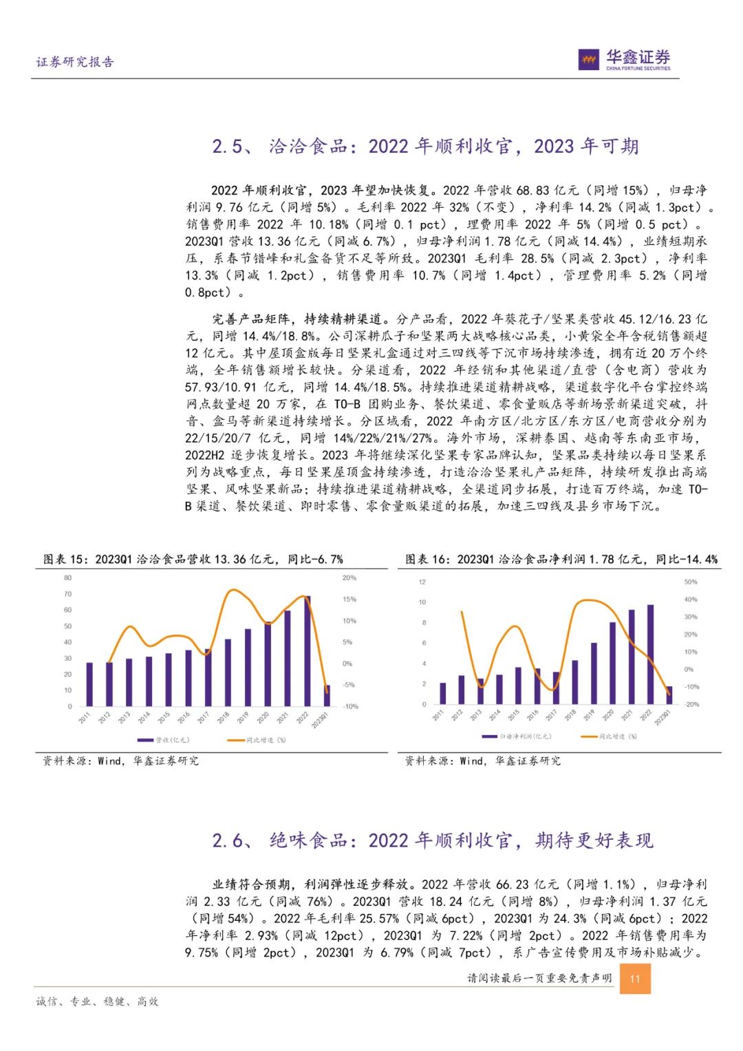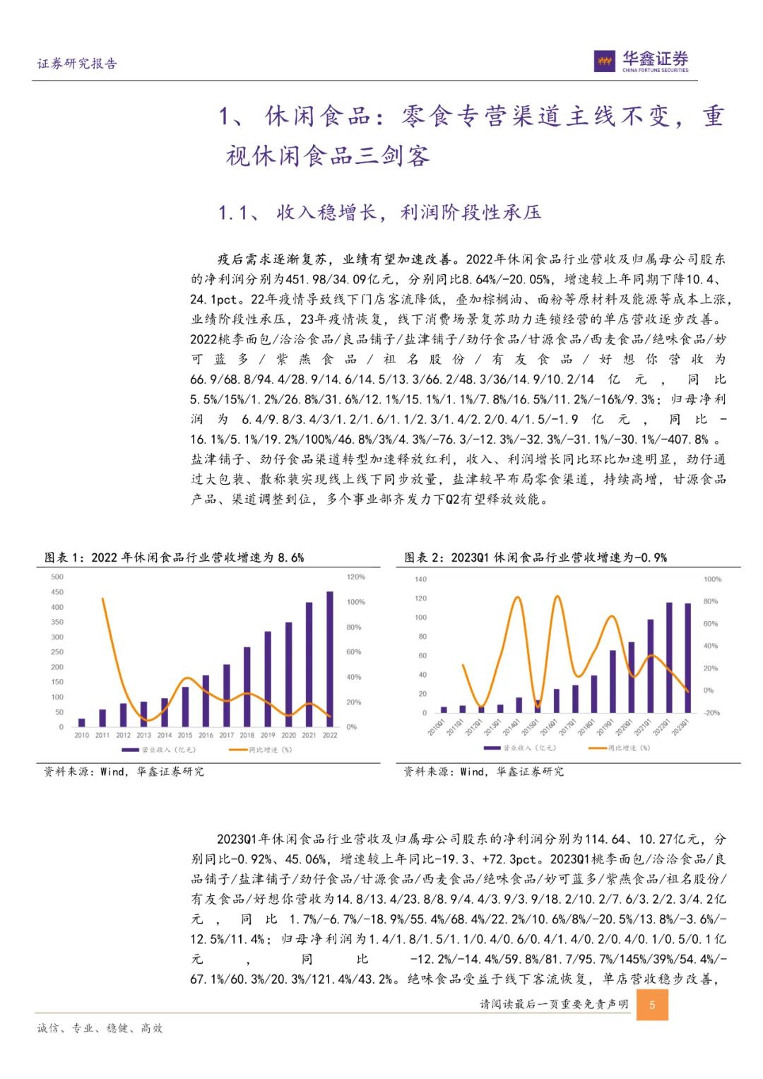 2023Q1年休闲食品行业营收及归母净利润分别为114.64/10.27亿元,分别同比-1%/+45%。