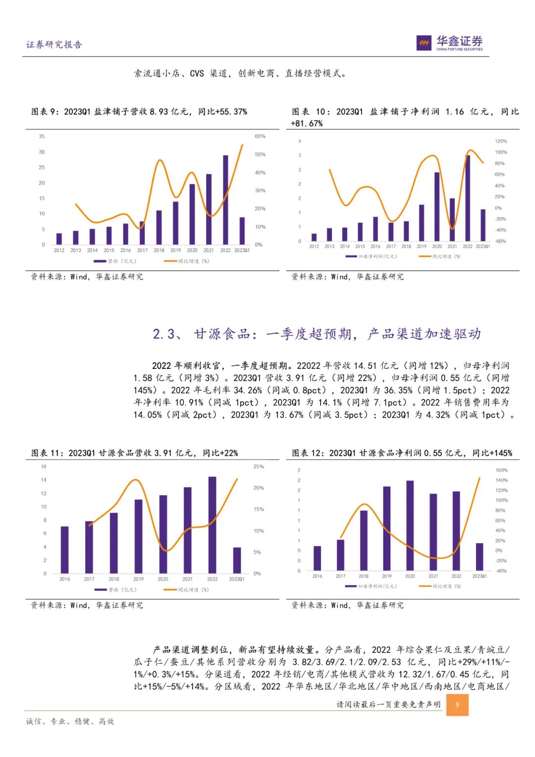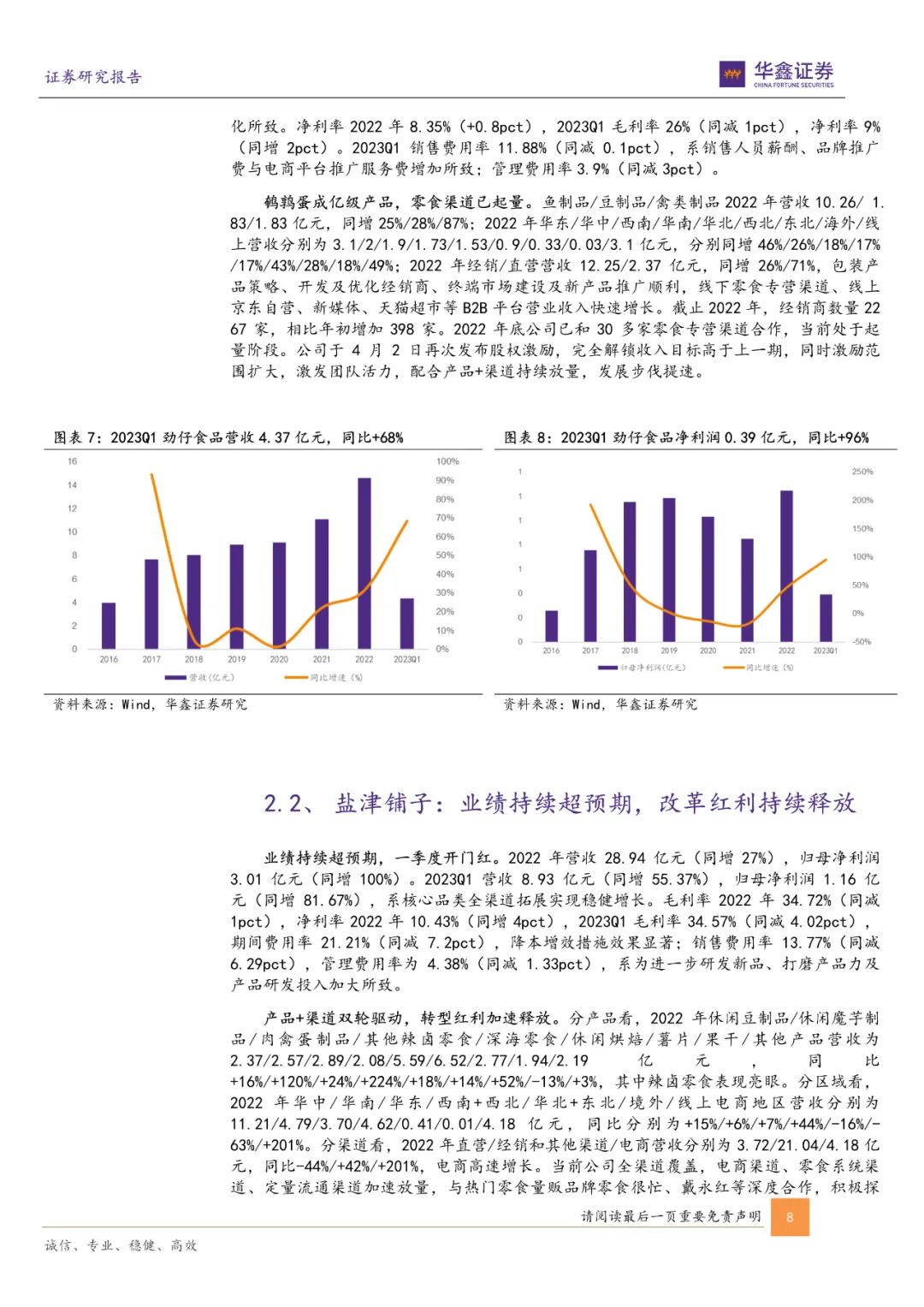 2023年疫情恢复,线下消费场景复苏助力连锁经营单店营收逐步改善。盐津铺子、劲仔食品渠道转型加速释放红利,收入、利润增长同比环比加速明显,甘源食品产品、渠道调整到位,多个事业部齐发力下二季度有望释放势能;紫燕、绝味疫情下逆势开店,销售旺季望加速单店修复和增长,随着鸭副、牛肉等价格回落,成本压力缓解带动利润改善。