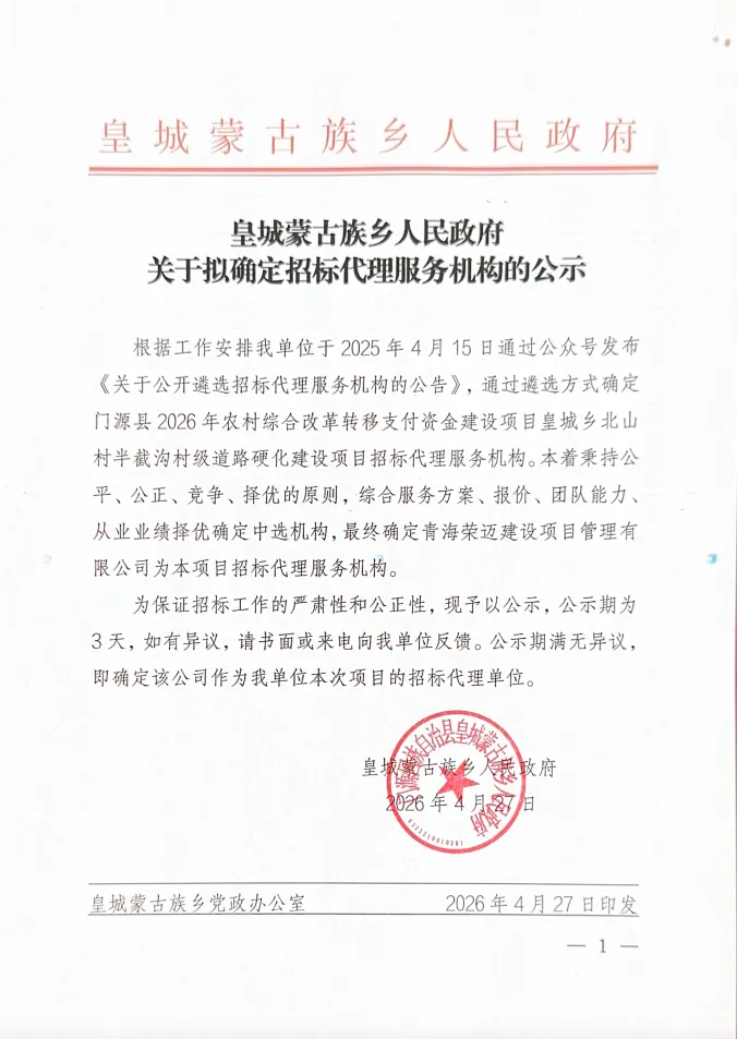 皇城蒙古族乡人民政府丨关于拟确定招标代理服务机构的公示
