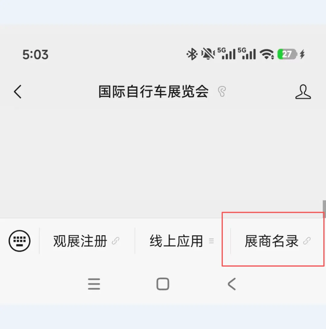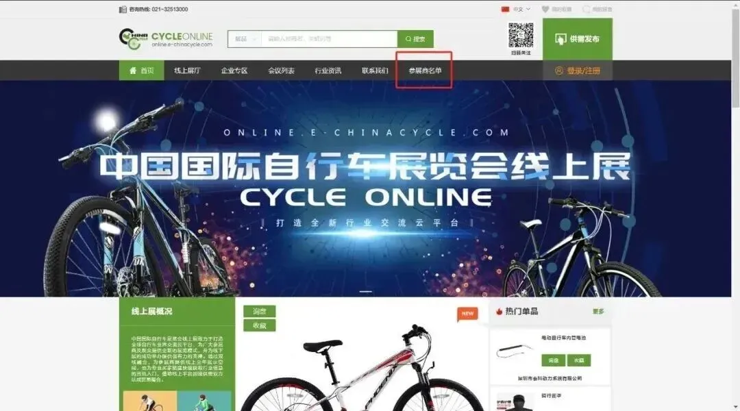 通过“国际自行车展览会”公众号进入线上展,可通过右下角“线上应用”按钮点击“线上展”也可以通过公众号页面的“服务”菜单进入“线上展”。