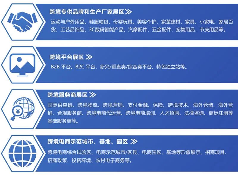 ●跨境服务商展区: 国际供应链、跨境物流、跨境营销、支付金融、保险、跨境技术、海外仓储、海外营销、合规服务商、跨境电商代运营、跨境电商培训、人才招聘、法律咨询、商标注册等基础服务商等;