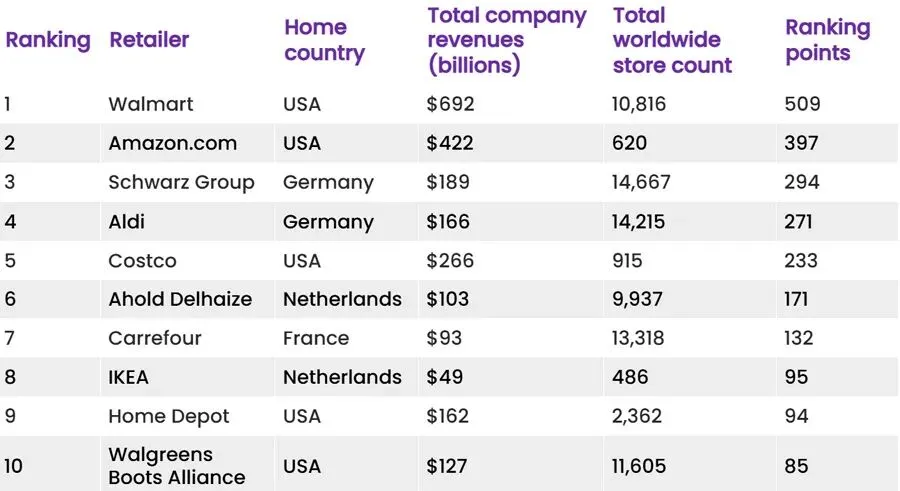 榜单根据零售商的国内和国际零售收入计算分数进行排名,上榜的公司要在至少三个国家和地区进行直接投资。国际零售商积分最多,国内零售销售占多数的零售商积分较少。