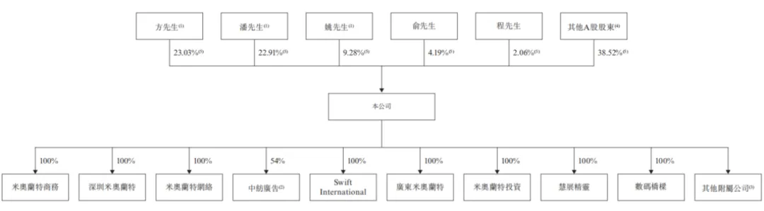 此次递表前,方欢胜持有米奥会展23.03%股权,为第一大股东;潘建军、姚宗宪、俞广庆、程奕俊分别持股22.91%、9.28%、4.19%及2.06%。