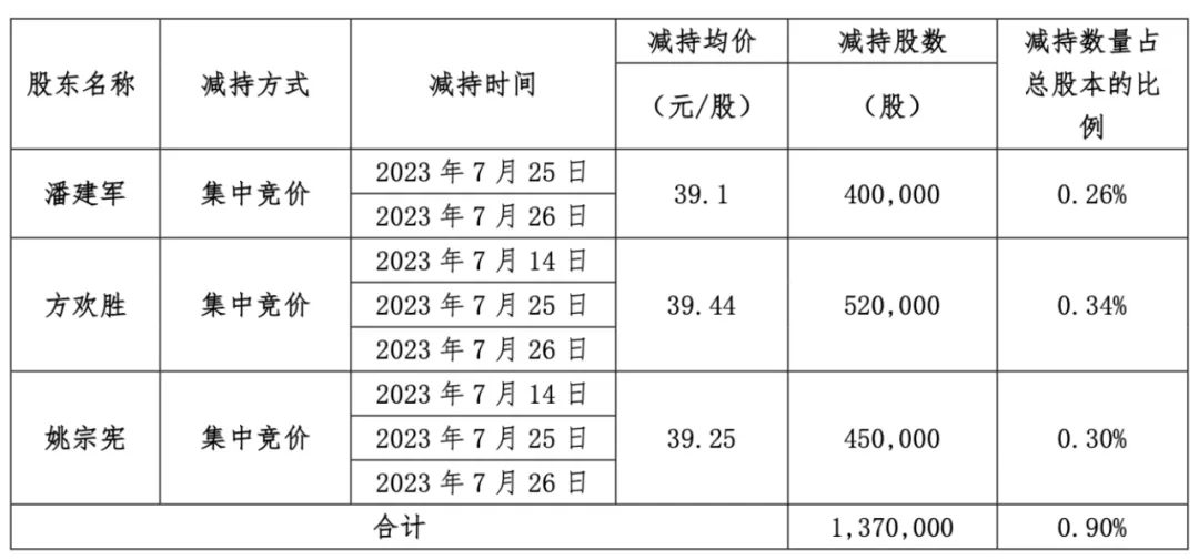 值得一提的是,在解除一致行动关系后,三人曾发起过大规模减持。2023年7月,潘建军、方欢胜、姚宗宪分别减持公司40万股股份、52万股股份、45万股股份,分别变现1564万元、2051.08万元、1766.35万元。