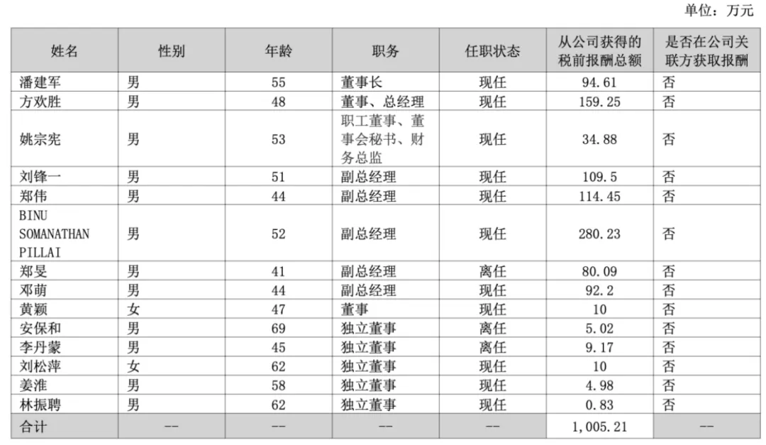 2025年,刘锋一、郑伟、BINU SOMANATHAN PILLAI年薪分别为109.5万元、114.45万元、280.23万元;同年,潘建军、方欢胜的年薪分别为94.61万元、159.25万元。