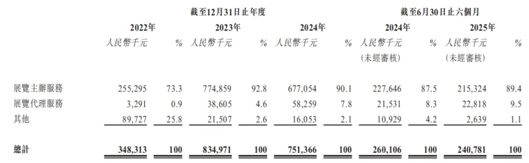 2022年-2025年,公司自办展收入分别为2.55亿元、7.75亿元、6.77亿元及7.16亿元。2023年同比大增203.52%,此后波动走低。