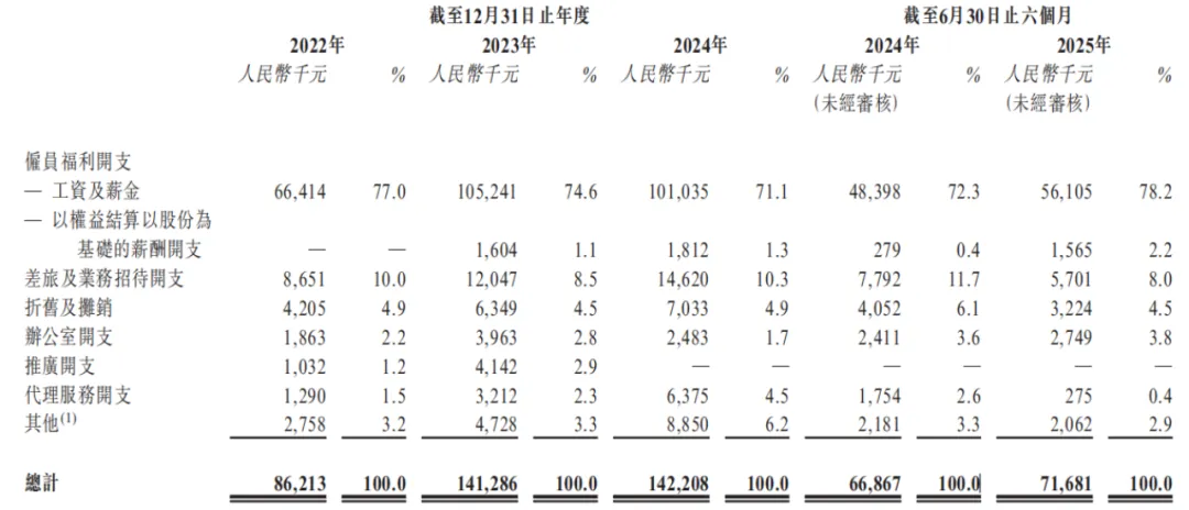 其中,销售人员薪酬福利占比超75%,各期为6641.4万元、1.05亿元、1.01亿元及1.2亿元。截至2025年末,公司销售人员共649名,占员工总数的65.49%,2025年销售人员人均月薪约1.55万元。
