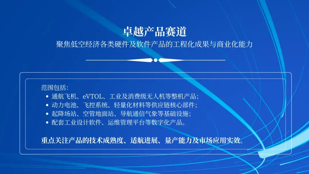 (1)卓越产品:聚焦低空经济各类硬件及软件产品的工程化成果与商业化能力。