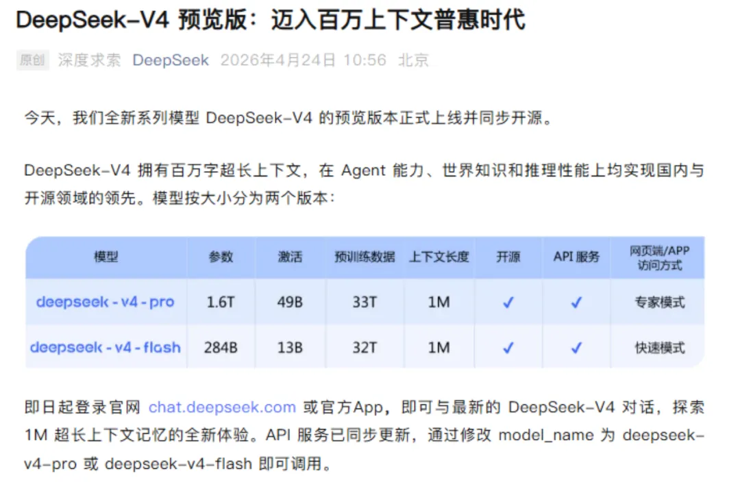 2026年4月24日,中国AI圈迎来了一个载入史册的节点。DeepSeek正式发布V4预览版并同步开源,创始人梁文锋带队完成了一场堪称奇迹的技术突围——彻底摆脱对英伟达CUDA生态的依赖,全面适配华为昇腾950PR芯片与CANNNext框架。凭借自研的mHC架构,以1/4的算力成本实现了百万字(100万Token)超长上下文与万亿参数的稳定运行。