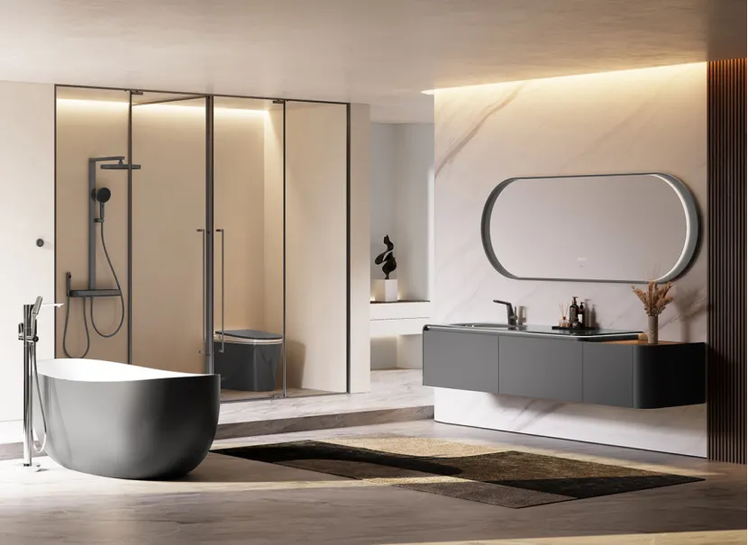 穹宇浴室柜:采用船型大盆设计,结合公爵亚克力一体成型技术与双色无缝拼接工艺,实现台盆与柜体色彩的自然过渡,适配现代轻奢、极简等多种家居风格,展现亚克力材料在造型与美学上的无限可能。