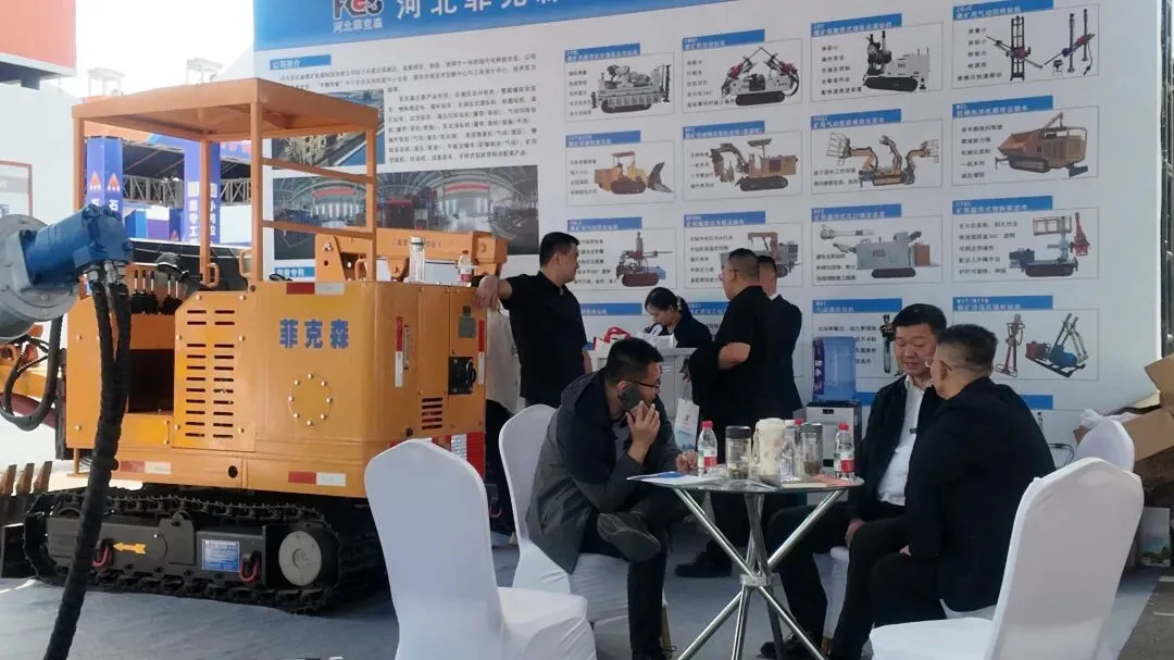 本次展会,河北菲克森紧扣 “智慧矿山、安全高效” 的行业需求,携全液压定向钻机、气动履带钻机、履带式平板车、履带式孔口排渣装置等多款明星装备集中亮相,全方位展示企业在煤矿钻探、巷道支护、井下运输等场景的一站式解决方案。