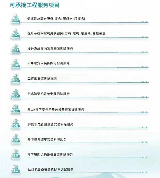 这些案例覆盖了换绳、清仓、罐道绳更换、井筒检修、风机安装、管路工程等多种工程类型,充分体现了中感集团在复杂工况下的系统集成与施工组织能力。