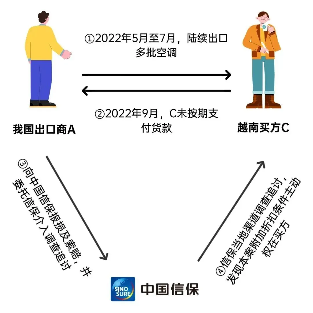 2022年5月至7月,出口商A向越南买方C陆续出口了多批空调。2022年9月,C未按期支付货款,A遂向中国信保报损及索赔,并委托中国信保介入调查追讨。