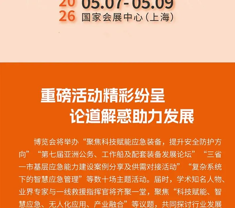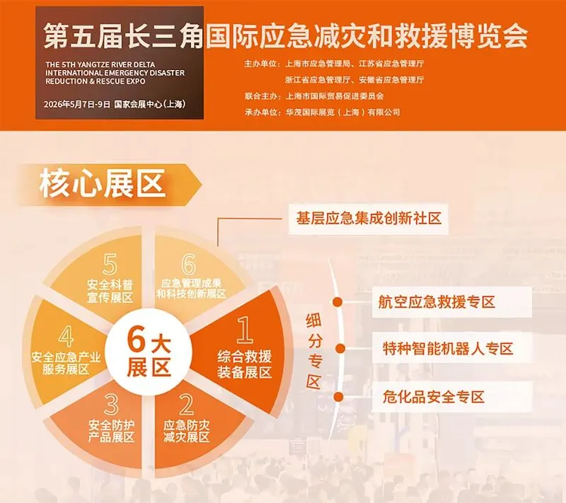2026 年 5 月 7 日至 9 日,立足长三角三省一市联合打造的长三角国际应急减灾救援博览会,将落地上海虹桥国家会展中心。