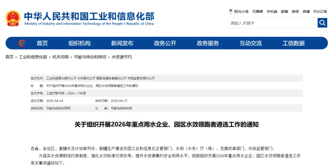 工业和信息化部、水利部、国家发展改革委、市场监管总局联合公告发布2026年重点用水企业、园区水效领跑者名单,有效期为两年(本年度及下一年度)。
